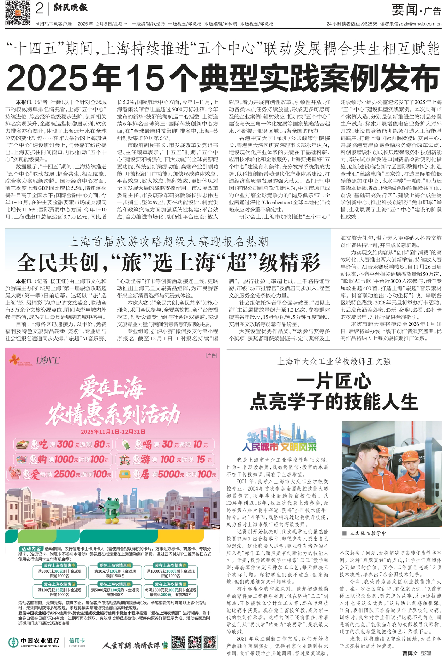 数据显示,“十四五”期间,上海持续推进“五个中心”联动发展、耦合共生、相互赋能,综合实力实现新跨越。国际经济中心方面,前三季度上海GDP同比增长5.5%,增速逐季提升且高于全国水平;国际金融中心方面,今年1-10月,在沪主要金融要素市场成交额同比增长11.6%;国际贸易中心方面,今年1-10月,上海进出口总额达到3.7万亿元,同比增长5.2%;国际航运中心方面,今年1-11月,上海港集装箱吞吐量超过5000万标准箱,今年发布的新华·波罗的海航运中心指数,上海连续6年排名全球第三;国际科技创新中心方面,在“全球最佳科技集群”排名中,上海-苏州创新集群位居第6位。