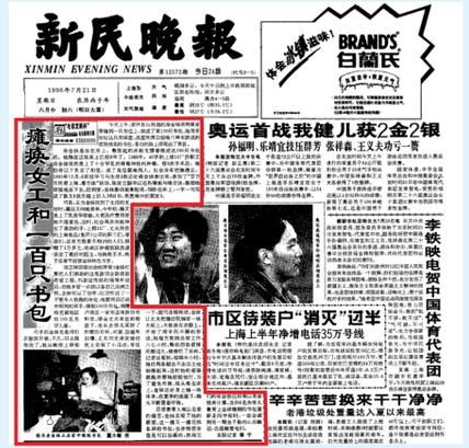 1996年7月21日,新民晚报刊登于头版头条的《瘫痪女工和一百只书包》