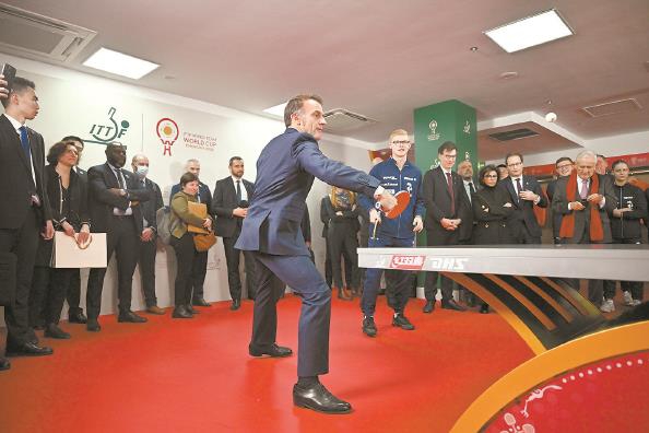 马克龙在华与中国乒乓球运动员切磋球技 图IC