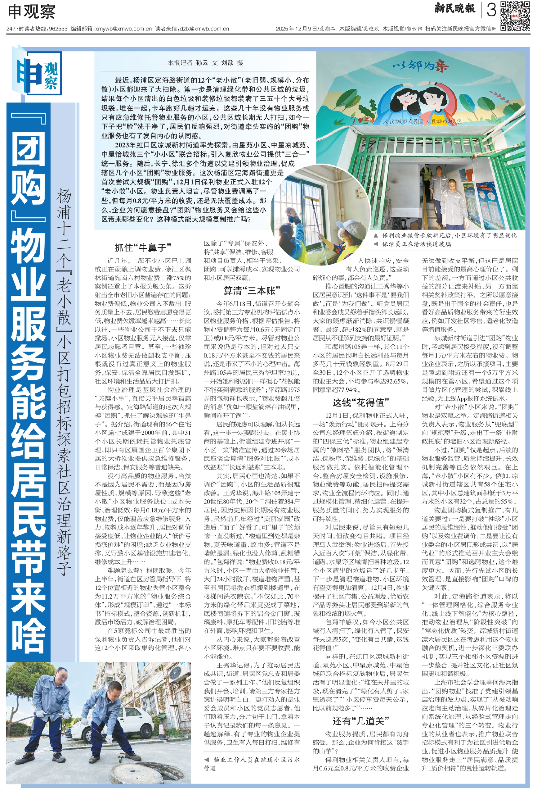 同样的,在虹口区凉城新村街道,星苑小区、中星凉城苑、中星怡城苑联合招标复欣物业后,居民生活有了明显变化:“堆在天井里的垃圾,现在清完了”“绿化有人剪了,家里透亮了”“小区停车费每天公示,比以前规范多了”……
