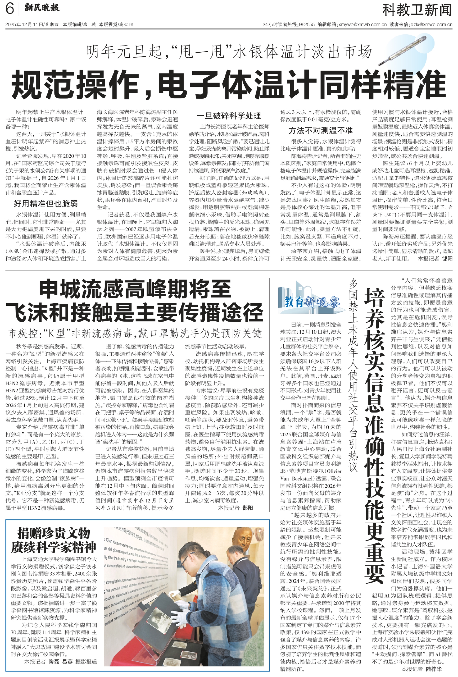 “水银体温计破碎后,内部汞(水银)会迅速挥发或扩散,通过多种途径对人体和环境造成损害。”上海长海医院老年科陈海涛副主任医师解释,体温计破碎后,汞珠会迅速挥发为无色无味的蒸气,室内温度越高挥发越快。一支含1克汞的体温计摔碎后,15平方米房间的汞浓度会短时飙升,吸入后会损伤中枢神经、呼吸、生殖及肾脏系统;直接接触汞珠可能引发接触性皮炎,皮肤有破损时汞会通过伤口侵入体内;体温计的玻璃碎片还可能扎伤皮肤,诱发感染;而一旦误食汞会腐蚀胃肠道黏膜,引发呕吐、腹痛等症状,汞还会在体内蓄积,严重时危及生命。
