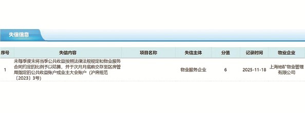 据了解,上海物业服务企业及项目经理信用评定基准分为0分,实行失信信息加分制,记分越高失信程度越重。此次地矿物业被记6分,对应“较严重失信行为”,失信内容明确标注为“未每季度末将当季公共收益按照法律法规规定和物业服务合同约定的比例予以结算,并于次月月底前交存至区房管局指定的公共收益账户或业主大会账户(依据沪房规范〔2023〕3号文件)”。