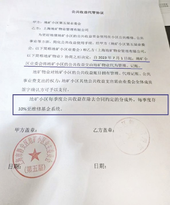 带着满腹疑虑,刘先生多次找到属地彭浦镇房办和小区业委会求证,一番追问后,一段未告知全体业主的“暗箱操作”浮出水面。原来,2023年7月,第五届业委会与地矿物业签订《公共收益代管协议》,约定从当月起,小区公共收益由地矿物业代为管理、记账。更为关键的是,协议还涉嫌“私相授受”调整了公共收益补充维修资金的分配比例。