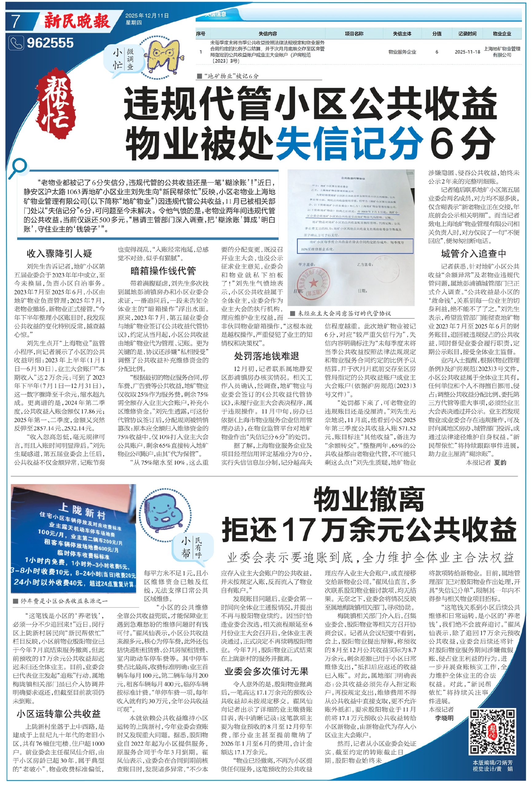 “老物业都被记了6分失信分,违规代管的公共收益还是一笔‘糊涂账’!”近日,静安区沪太路1063弄地矿小区业主刘先生向“新民帮侬忙”反映,小区老物业上海地矿物业管理有限公司(以下简称“地矿物业”)因违规代管公共收益,11月已被相关部门处以“失信记分”6分,可问题至今未解决。令他气愤的是,老物业两年间违规代管的公共收益,当前仅返还500多元,“恳请主管部门深入调查,把‘糊涂账’算成‘明白账’,守住业主的‘钱袋子’”。