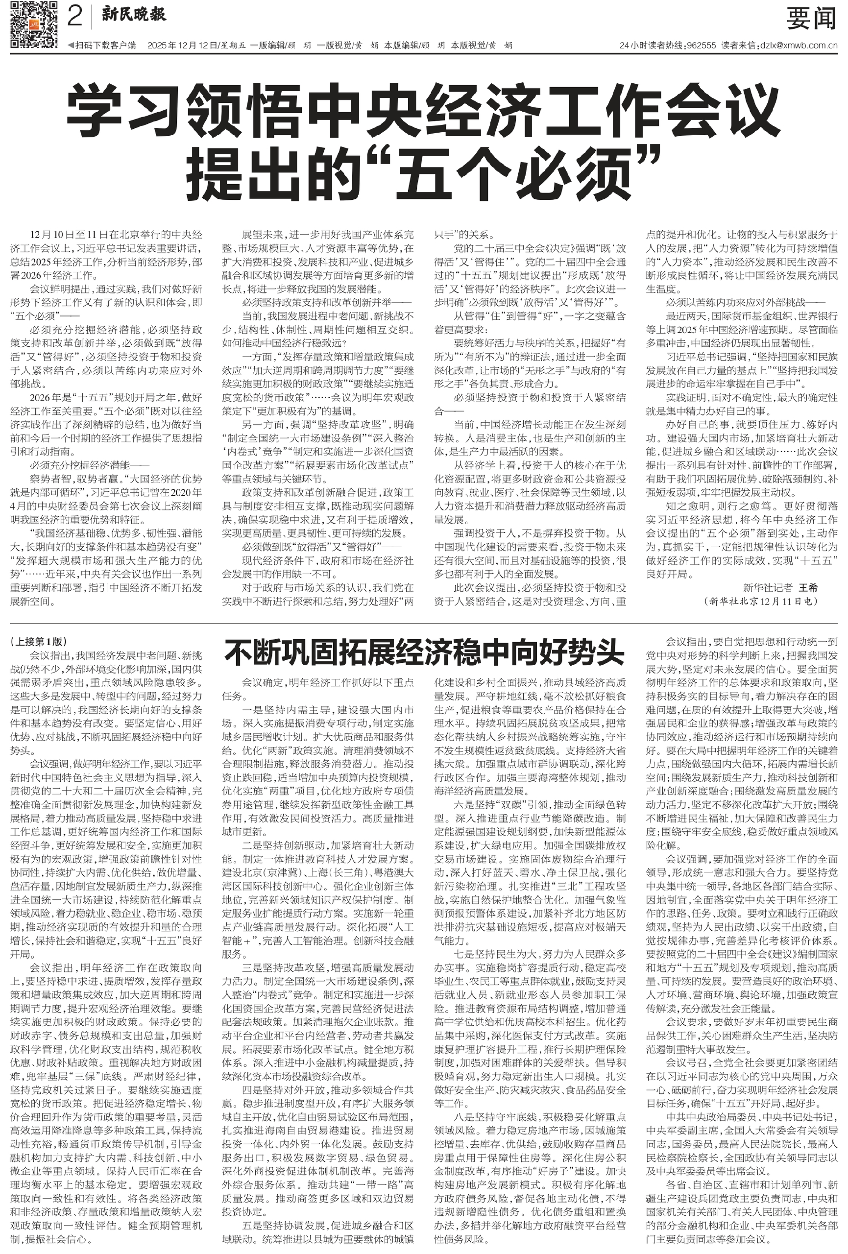 2026年是“十五五”规划开局之年,做好经济工作至关重要。“五个必须”既对以往经济实践作出了深刻精辟的总结,也为做好当前和今后一个时期的经济工作提供了思想指引和行动指南。