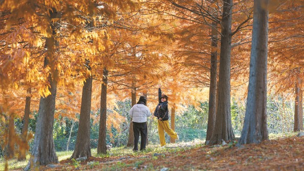 松江区米市渡松南郊野公园迎来水杉林最佳观赏期。成片水杉褪去翠绿,换上冬季“五彩衣裳”,从金黄到橙红再到深赭,层层递进的色彩交织成一幅绚丽油画,吸引众多市民游客前来沉浸式体验这短暂而珍贵的自然盛宴。 本报记者 陶磊 通讯员 姜辉辉 摄影报道