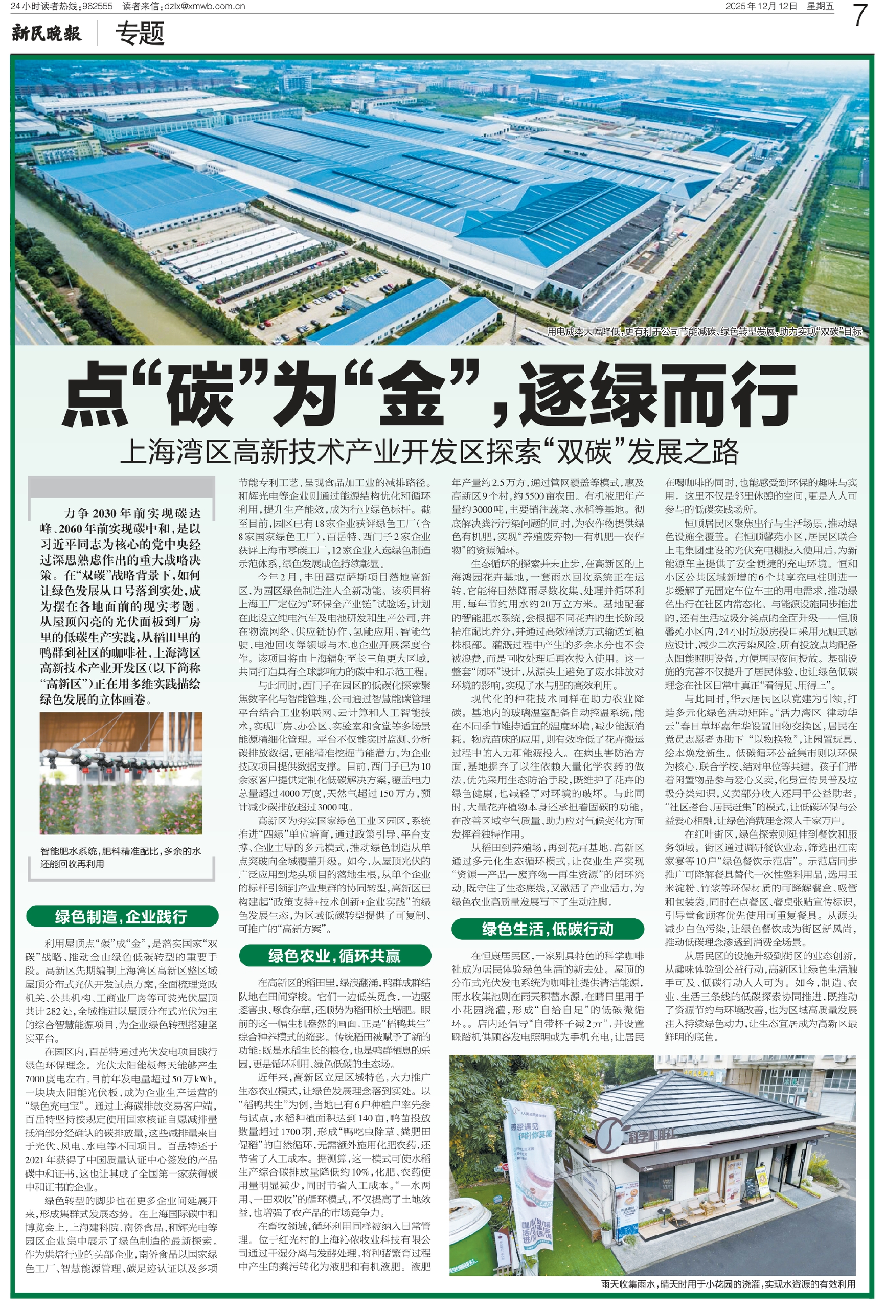 力争2030年前实现碳达峰、2060年前实现碳中和,是以习近平同志为核心的党中央经过深思熟虑作出的重大战略决策。在“双碳”战略背景下,如何让绿色发展从口号落到实处,成为摆在各地面前的现实考题。从屋顶闪亮的光伏面板到厂房里的低碳生产实践,从稻田里的鸭群到社区的咖啡社,上海湾区高新技术产业开发区(以下简称“高新区”)正在用多维实践描绘绿色发展的立体画卷。