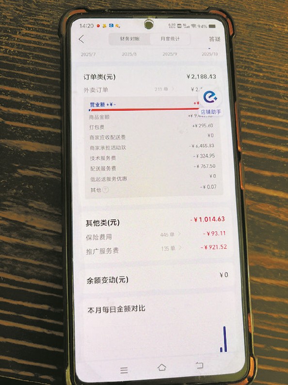 张先生告诉记者,他在上海经营着一家牛肉汤面馆,为拓宽客源,面馆也上线了多个外卖平台。然而,他在对账时发现,“饿了么”平台的到账金额远低于预期。“订单越多亏钱越多,连成本都覆盖不了。”张先生仔细核查后台明细,才发觉每月账单中都藏着一笔收费不菲的“推广服务费”,订单越多扣费金额越高。这正是让张先生直呼“赔惨了”的核心原因。