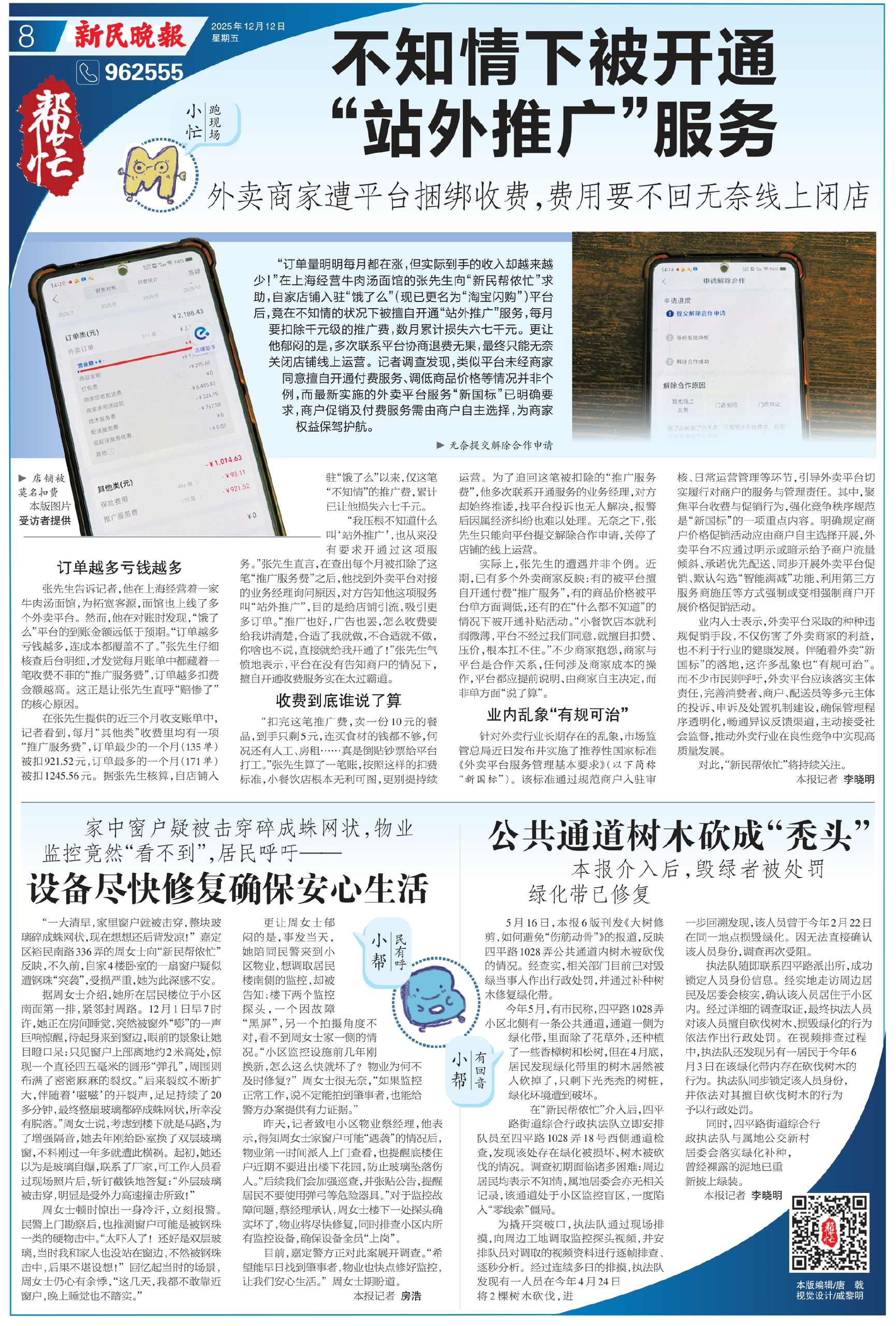 “订单量明明每月都在涨,但实际到手的收入却越来越少!”在上海经营牛肉汤面馆的张先生向“新民帮侬忙”求助,自家店铺入驻“饿了么”(现已更名为“淘宝闪购”)平台后,竟在不知情的状况下被擅自开通“站外推广”服务,每月要扣除千元级的推广费,数月累计损失六七千元。更让他郁闷的是,多次联系平台协商退费无果,最终只能无奈关闭店铺线上运营。记者调查发现,类似平台未经商家同意擅自开通付费服务、调低商品价格等情况并非个例,而最新实施的外卖平台服务“新国标”已明确要求,商户促销及付费服务需由商户自主选择,为商家权益保驾护航。