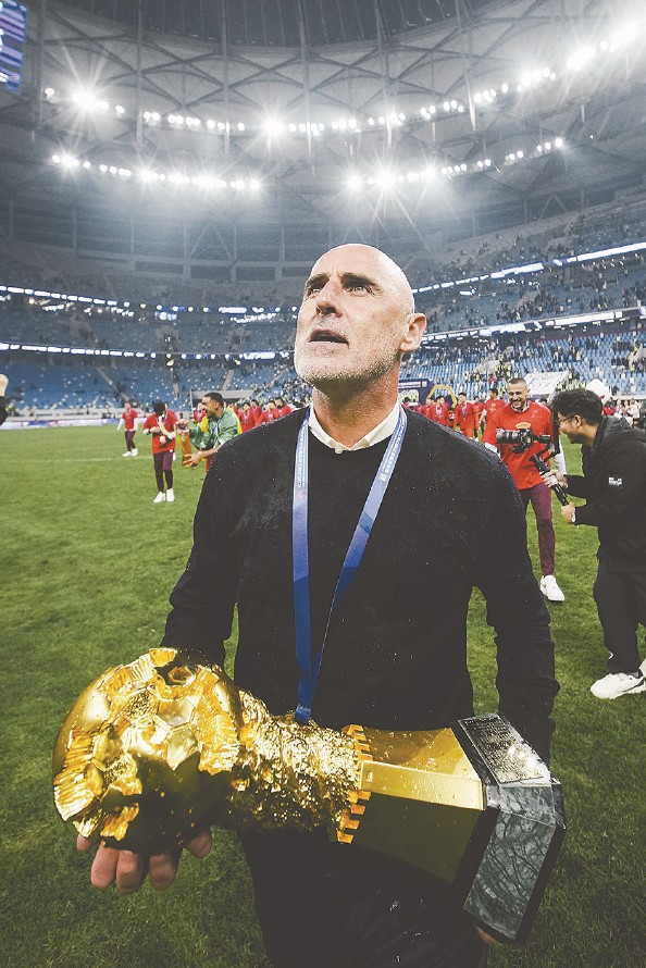 穆斯卡特手捧中超冠军奖杯却无缘最佳主教练 本版图片 记者 李铭珅 摄
