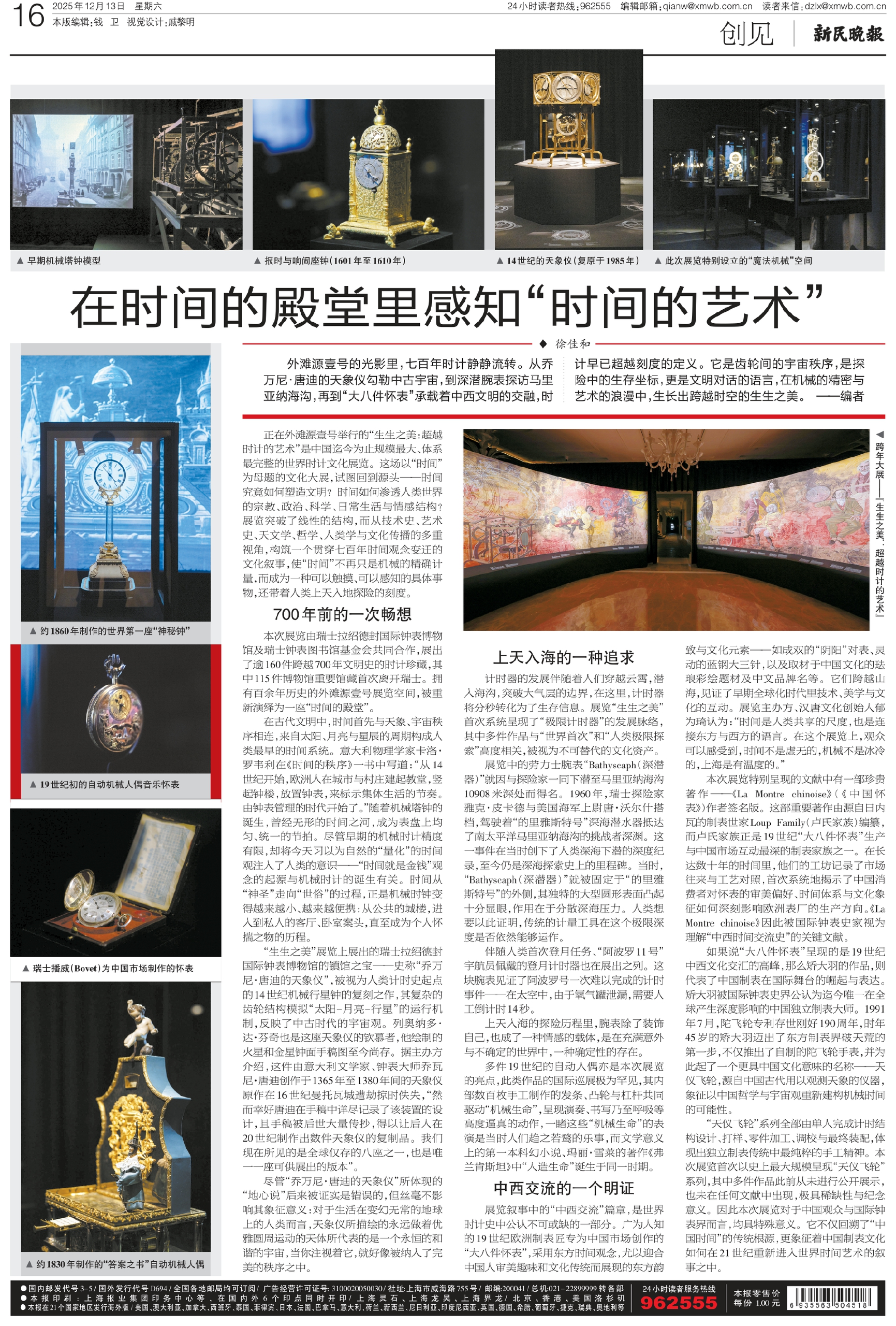 外滩源壹号的光影里,七百年时计静静流转。从乔万尼·唐迪的天象仪勾勒中古宇宙,到深潜腕表探访马里亚纳海沟,再到“大八件怀表”承载着中西文明的交融,时计早已超越刻度的定义。它是齿轮间的宇宙秩序,是探险中的生存坐标,更是文明对话的语言,在机械的精密与艺术的浪漫中,生长出跨越时空的生生之美。 ——编者