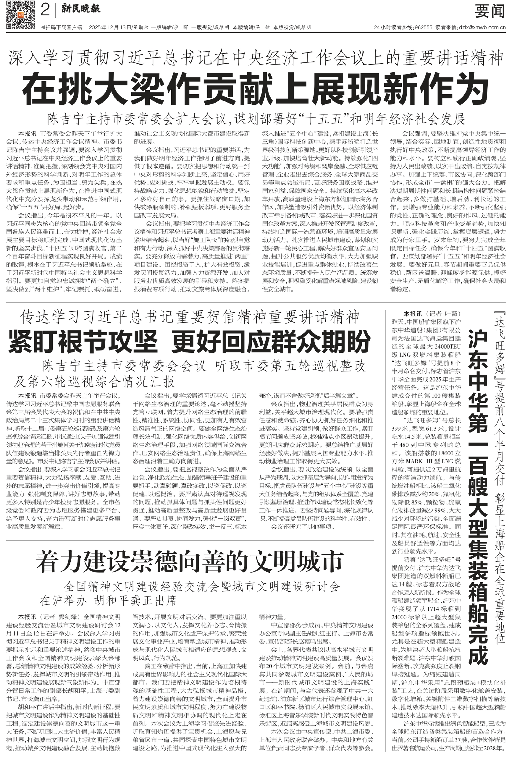 本报讯 市委常委会昨天下午举行扩大会议,传达中央经济工作会议精神。市委书记陈吉宁主持会议并强调,要深入学习贯彻习近平总书记在中央经济工作会议上的重要讲话精神,准确把握、深刻领会党中央对国内外经济形势的科学判断、对明年工作的总体要求和重点任务,为国担当、勇为尖兵,在挑大梁作贡献上展现新作为,在推进中国式现代化中充分发挥龙头带动和示范引领作用,确保“十五五”开好局、起好步。