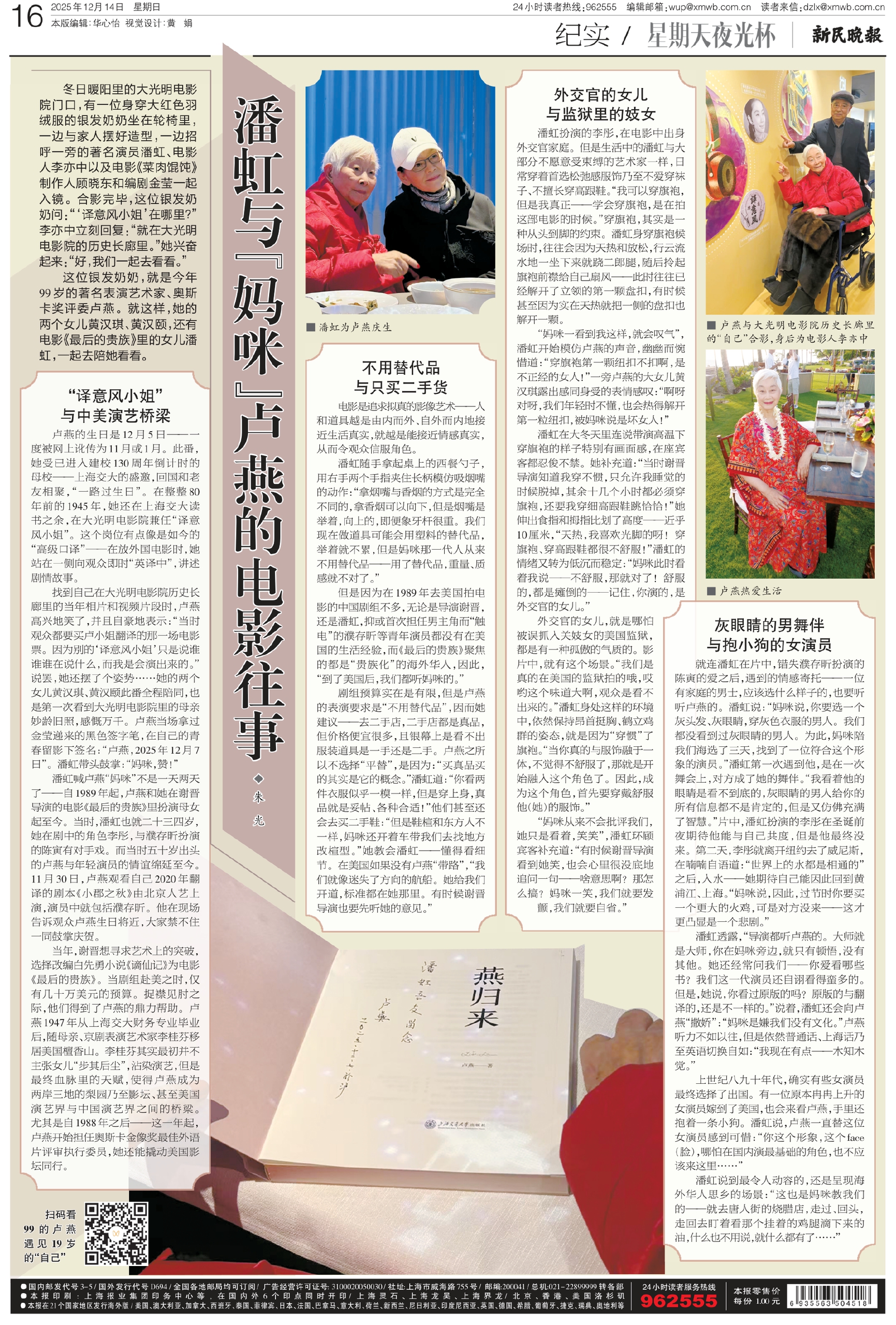 卢燕的生日是12月5日——一度被网上讹传为11月或1月。此番,她受已进入建校130周年倒计时的母校——上海交大的盛邀,回国和老友相聚,“一路过生日”。在整整80年前的1945年,她还在上海交大读书之余,在大光明电影院兼任“译意风小姐”。这个岗位有点像是如今的“高级口译”——在放外国电影时,她站在一侧向观众即时“英译中”,讲述剧情故事。
