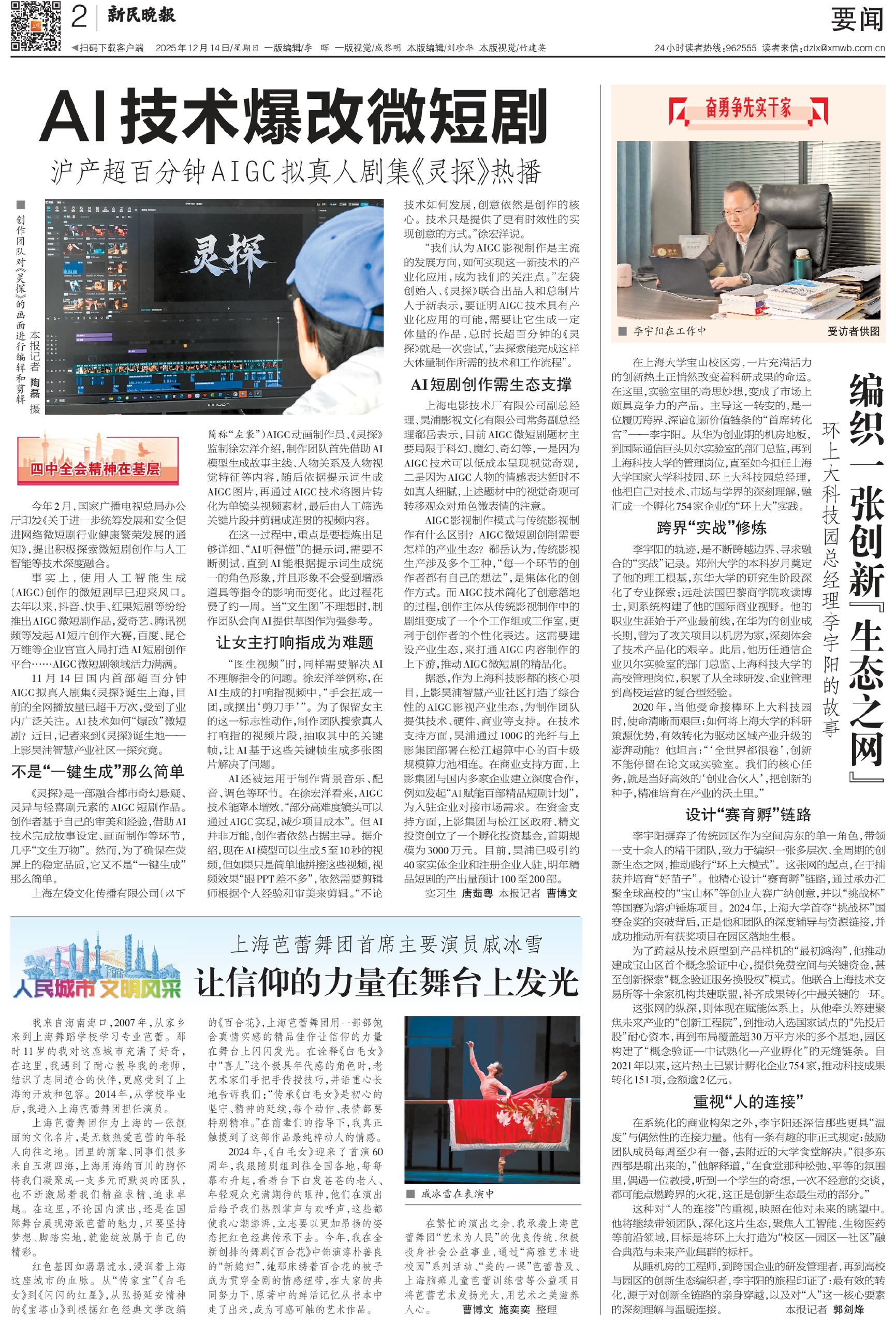 11月14日国内首部超百分钟AIGC拟真人剧集《灵探》诞生上海,目前的全网播放量已超千万次,受到了业内广泛关注。AI技术如何“爆改”微短剧?近日,记者来到《灵探》诞生地——上影昊浦智慧产业社区一探究竟。