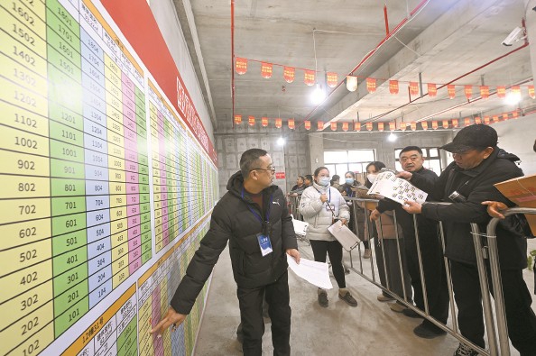 绣南雅苑选房现场,工作人员会将已确认的房源贴上五角星进行标注