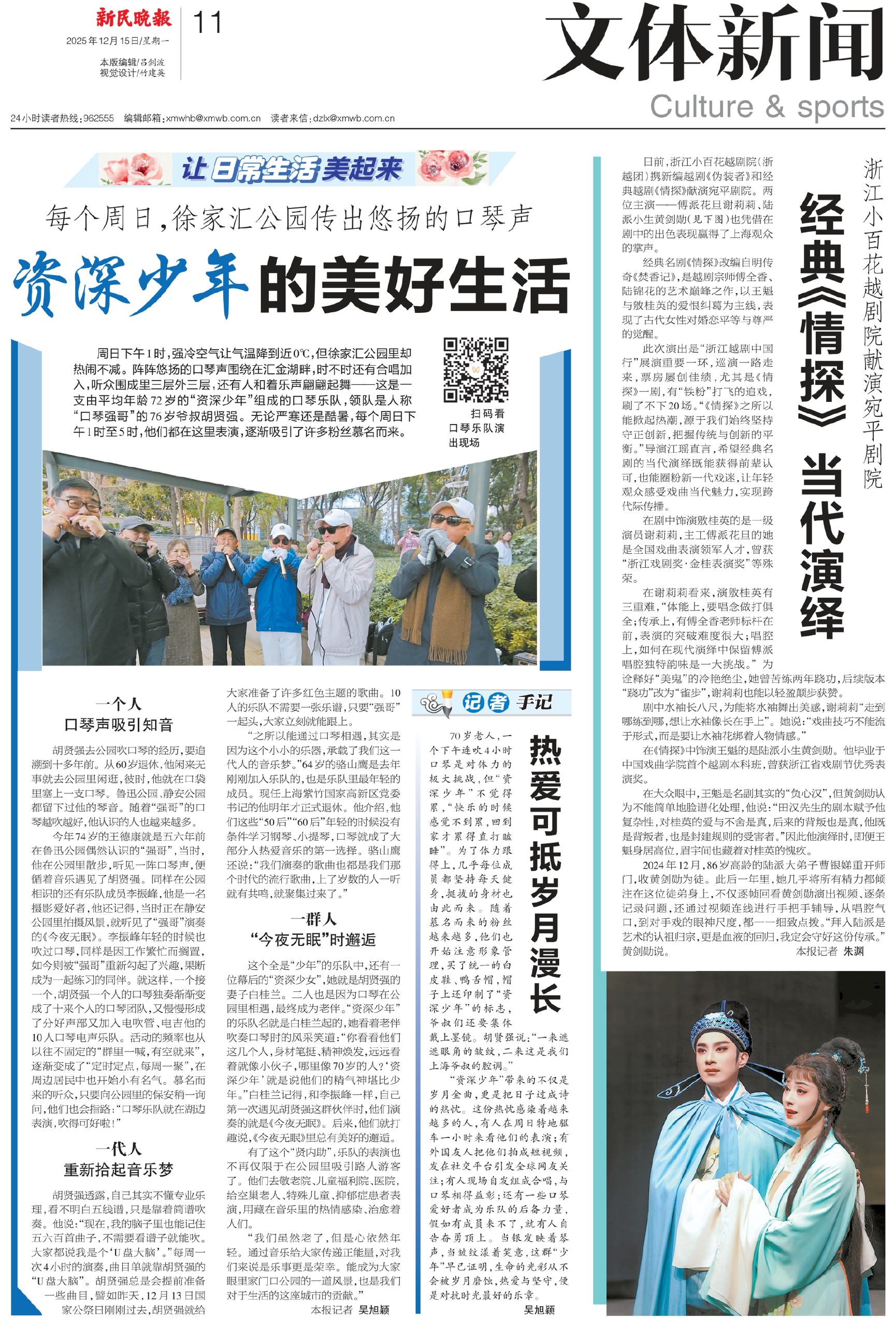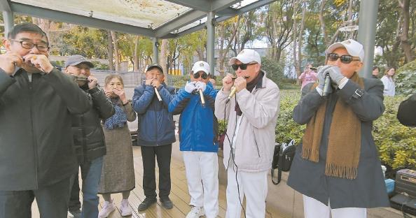 周日下午1时,强冷空气让气温降到近0℃,但徐家汇公园里却热闹不减。阵阵悠扬的口琴声围绕在汇金湖畔,时不时还有合唱加入,听众围成里三层外三层,还有人和着乐声翩翩起舞——这是一支由平均年龄72岁的“资深少年”组成的口琴乐队,领队是人称“口琴强哥”的76岁爷叔胡贤强。无论严寒还是酷暑,每个周日下午1时至5时,他们都在这里表演,逐渐吸引了许多粉丝慕名而来。