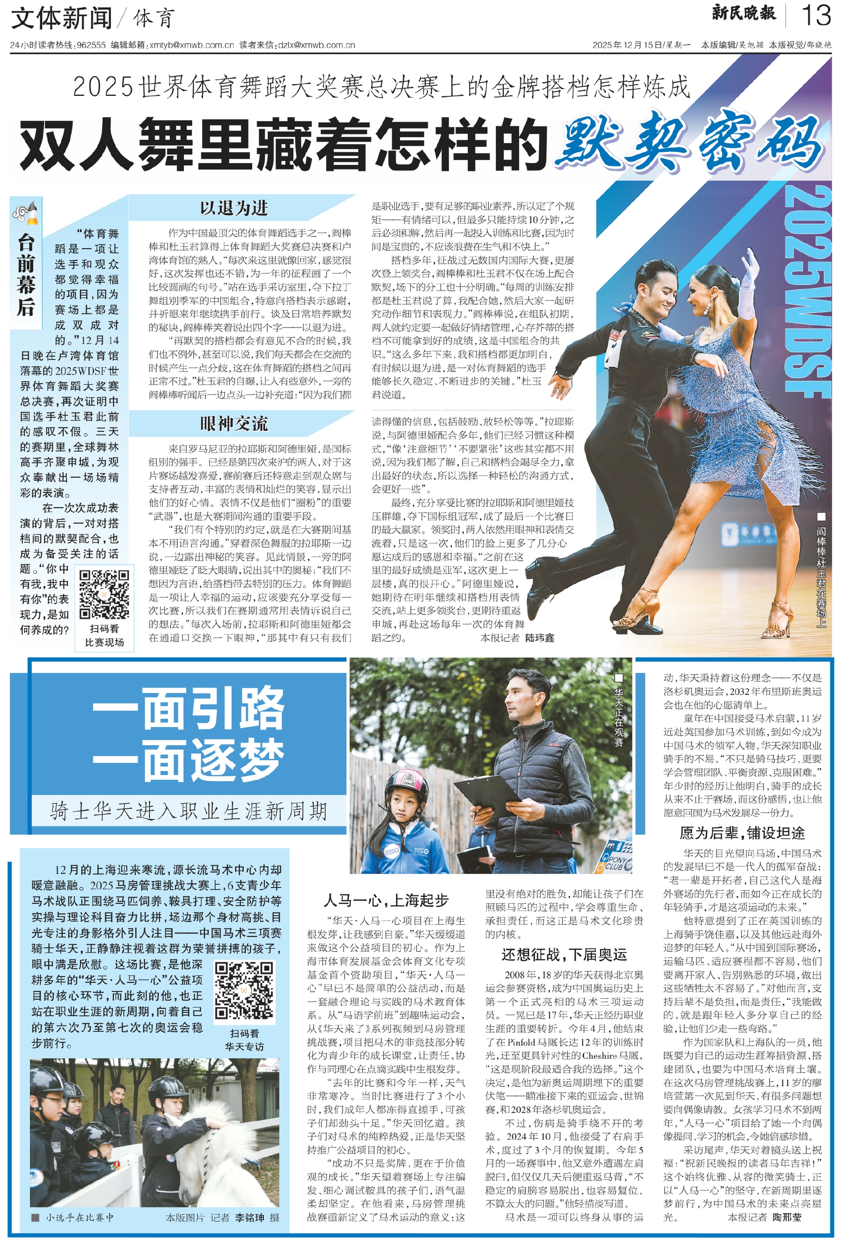 “体育舞蹈是一项让选手和观众都觉得幸福的项目,因为赛场上都是成双成对的。”12月14日晚在卢湾体育馆落幕的2025WDSF世界体育舞蹈大奖赛总决赛,再次证明中国选手杜玉君此前的感叹不假。三天的赛期里,全球舞林高手齐聚申城,为观众奉献出一场场精彩的表演。