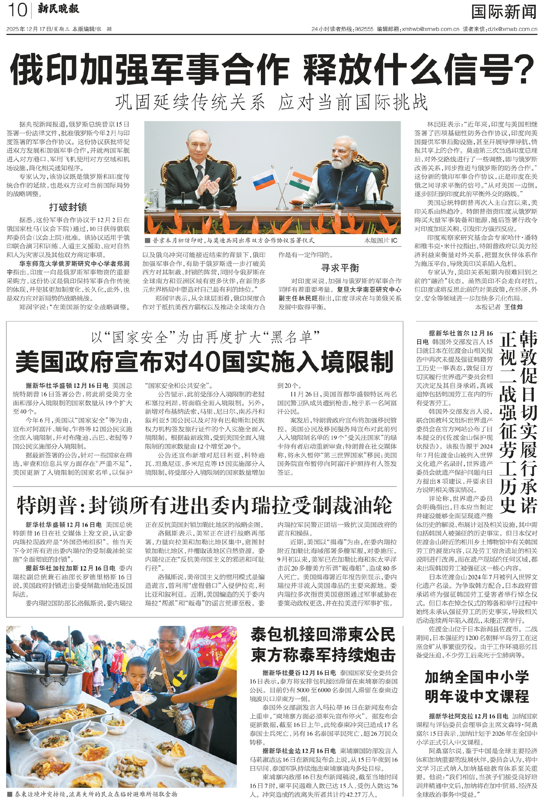 据悉,这份军事合作协议于12月2日在俄国家杜马(议会下院)通过,10日获得俄联邦委员会(议会上院)批准。该协议适用于俄印联合演习和训练、人道主义援助、应对自然和人为灾害以及其他双方商定事项。