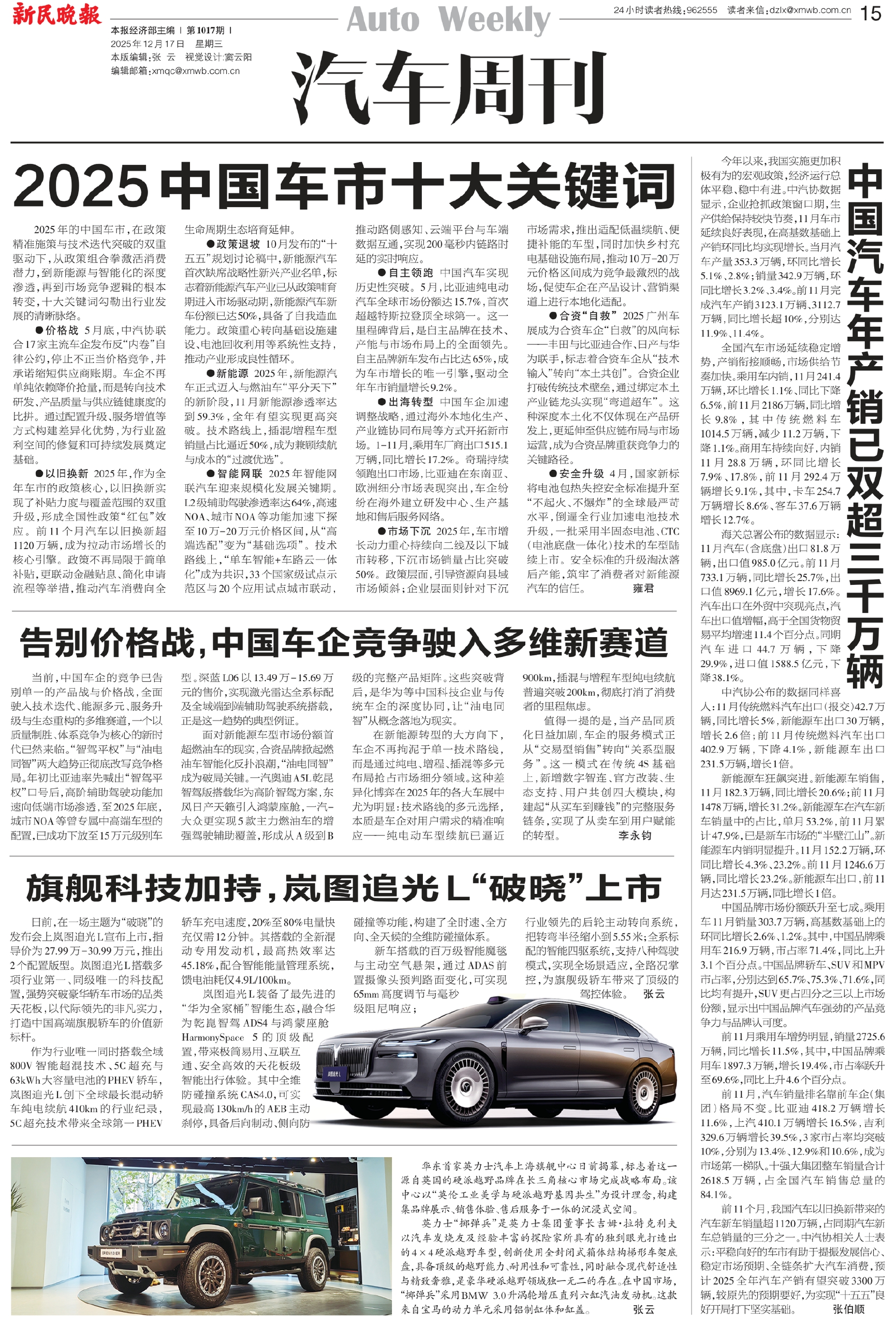 ●自主领跑 中国汽车实现历史性突破。5月,比亚迪纯电动汽车全球市场份额达15.7%,首次超越特斯拉登顶全球第一。这一里程碑背后,是自主品牌在技术、产能与市场布局上的全面领先。自主品牌新车发布占比达65%,成为车市增长的唯一引擎,驱动全年车市销量增长9.2%。