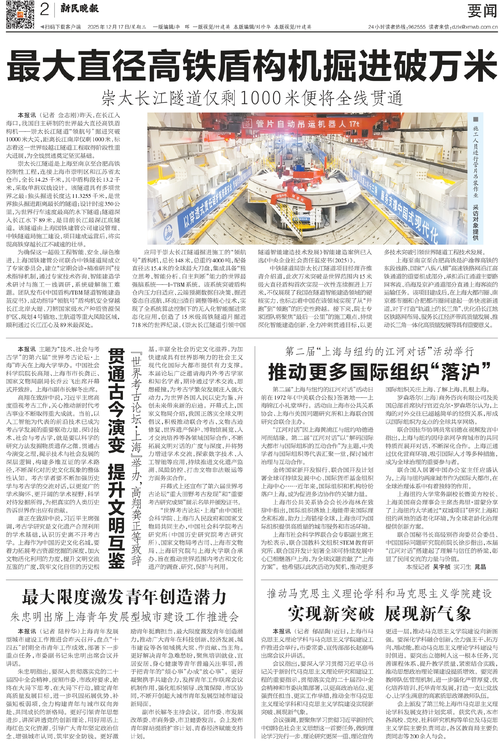 中铁隧道局崇太长江隧道项目经理许维青介绍道,此次万米突破是世界范围内15米级大直径盾构首次实现一次性连续掘进上万米,不仅展现了我国在隧道智能建造领域的硬核实力,也标志着中国在该领域实现了从“并跑”到“领跑”的历史性跨越。接下来,院士专家团队将聚焦“最后一公里”的施工难点,持续深化智能建造创新,全力冲刺贯通目标,以更多技术突破引领世界隧道工程技术发展。