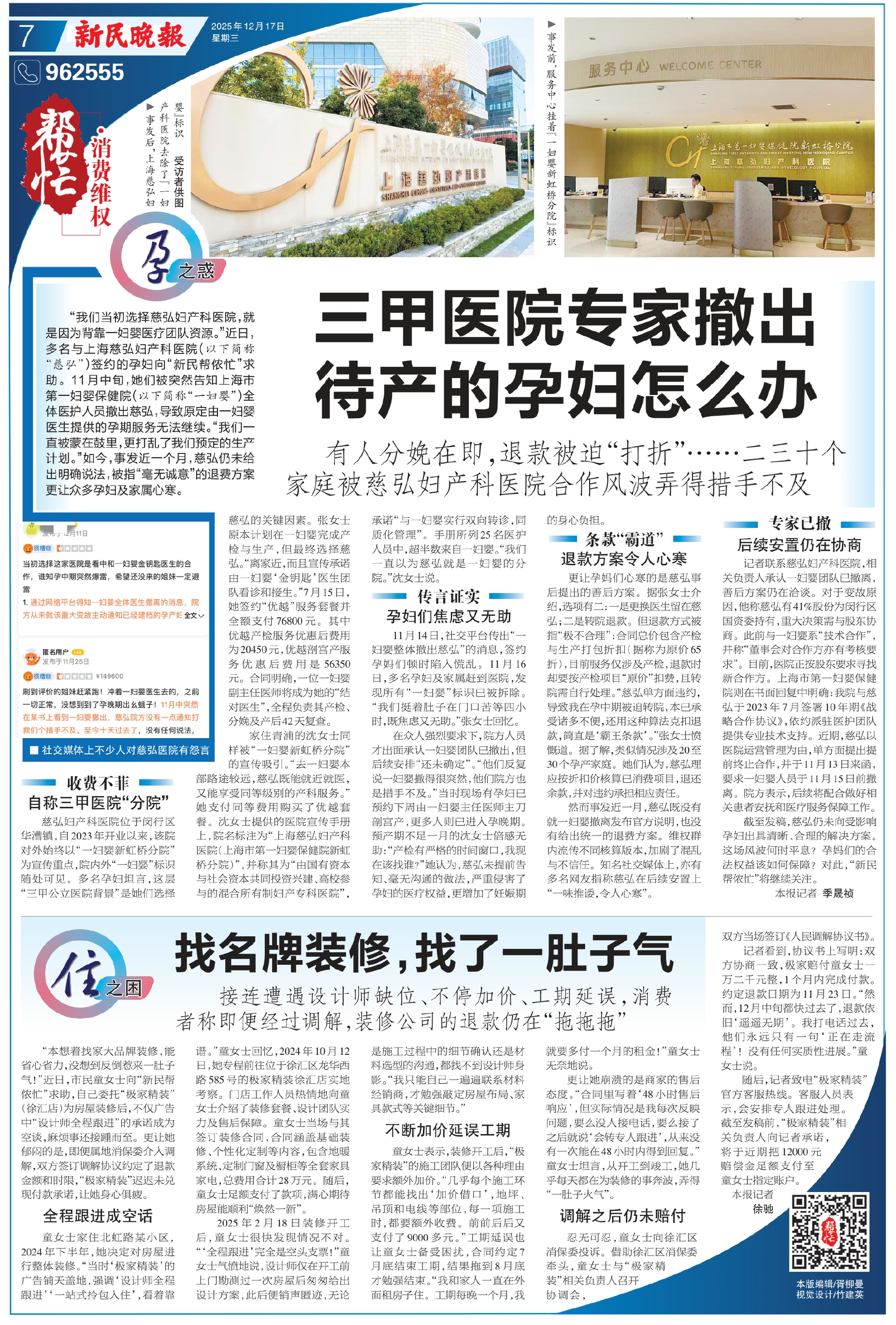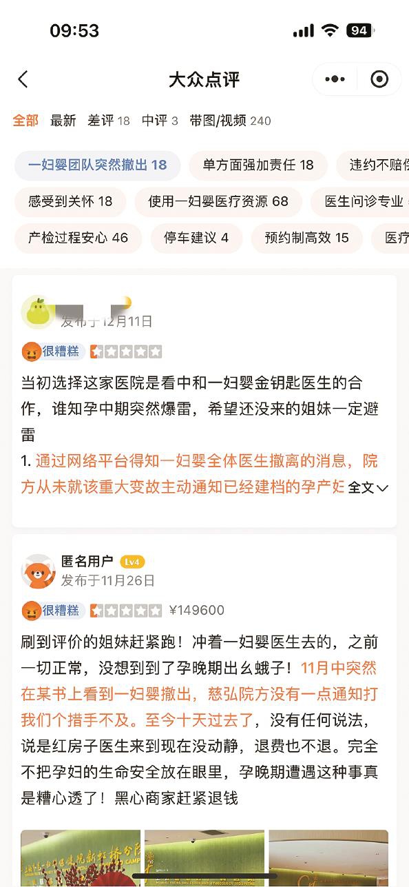 在众人强烈要求下,院方人员才出面承认一妇婴团队已撤出,但后续安排“还未确定”。“他们反复说一妇婴撤得很突然,他们院方也是措手不及。”当时现场有孕妇已预约下周由一妇婴主任医师主刀剖宫产,更多人则已进入孕晚期。预产期不足一月的沈女士倍感无助:“产检有严格的时间窗口,我现在该找谁?”她认为,慈弘未提前告知、毫无沟通的做法,严重侵害了孕妇的医疗权益,更增加了妊娠期的身心负担。