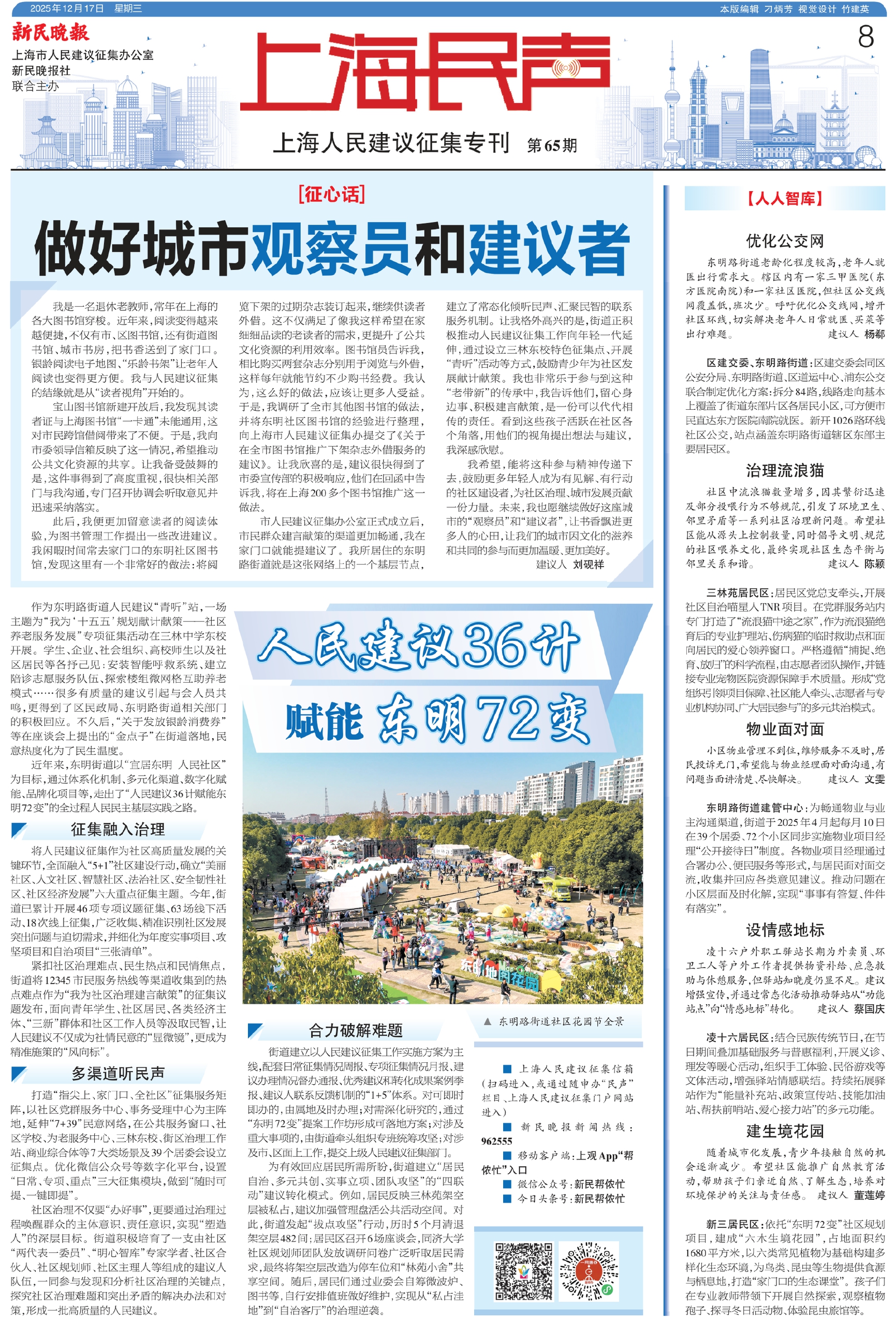市人民建议征集办公室正式成立后,市民群众建言献策的渠道更加畅通,我在家门口就能提建议了。我所居住的东明路街道就是这张网络上的一个基层节点,建立了常态化倾听民声、汇聚民智的联系服务机制。让我格外高兴的是,街道正积极推动人民建议征集工作向年轻一代延伸,通过设立三林东校特色征集点、开展“青听”活动等方式,鼓励青少年为社区发展献计献策。我也非常乐于参与到这种“老带新”的传承中,我告诉他们,留心身边事、积极建言献策,是一份可以代代相传的责任。看到这些孩子活跃在社区各个角落,用他们的视角提出想法与建议,我深感欣慰。