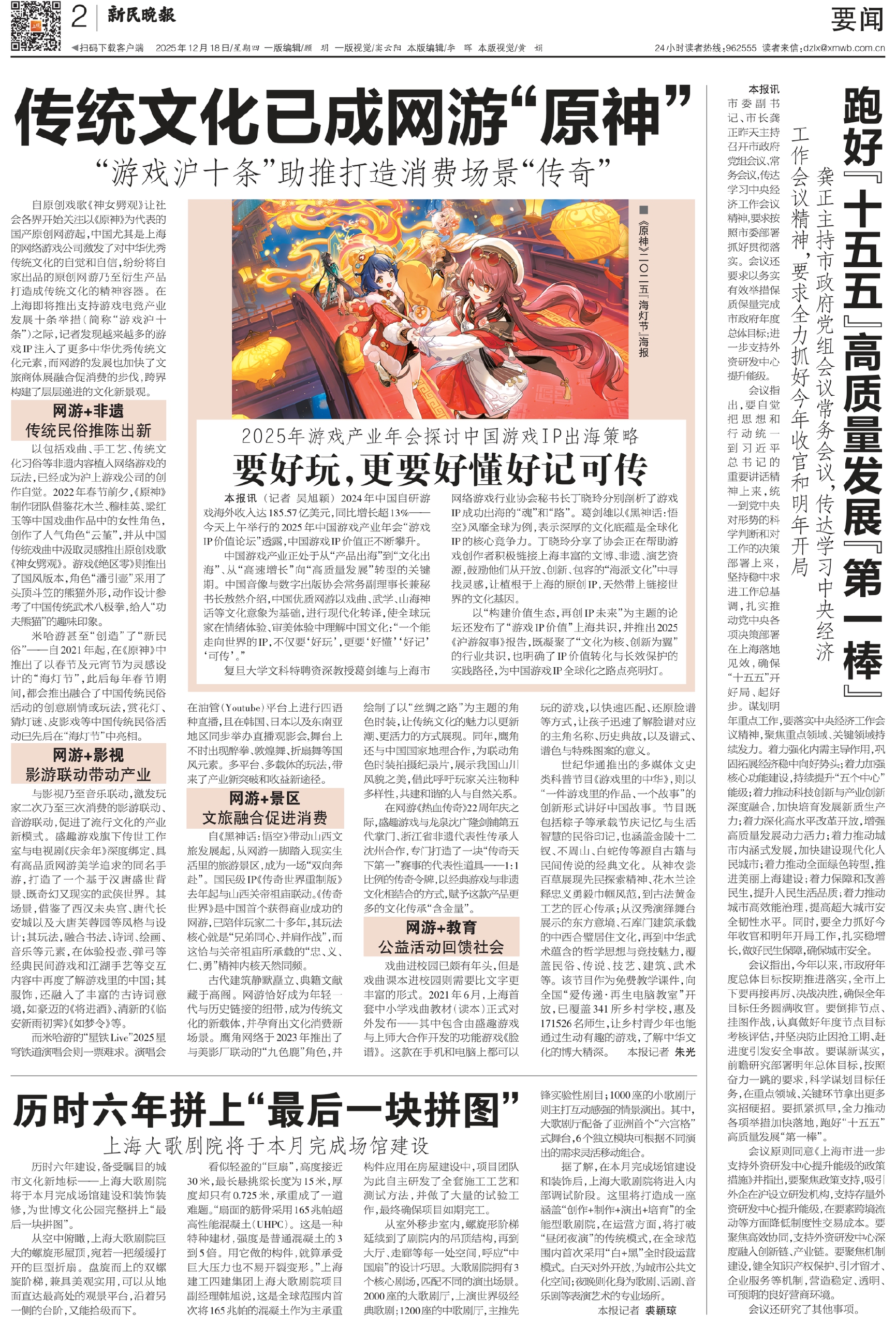 自原创戏歌《神女劈观》让社会各界开始关注以《原神》为代表的国产原创网游起,中国尤其是上海的网络游戏公司激发了对中华优秀传统文化的自觉和自信,纷纷将自家出品的原创网游乃至衍生产品打造成传统文化的精神容器。在上海即将推出支持游戏电竞产业发展十条举措(简称“游戏沪十条”)之际,记者发现越来越多的游戏IP注入了更多中华优秀传统文化元素,而网游的发展也加快了文旅商体展融合促消费的步伐,跨界构建了层层递进的文化新景观。