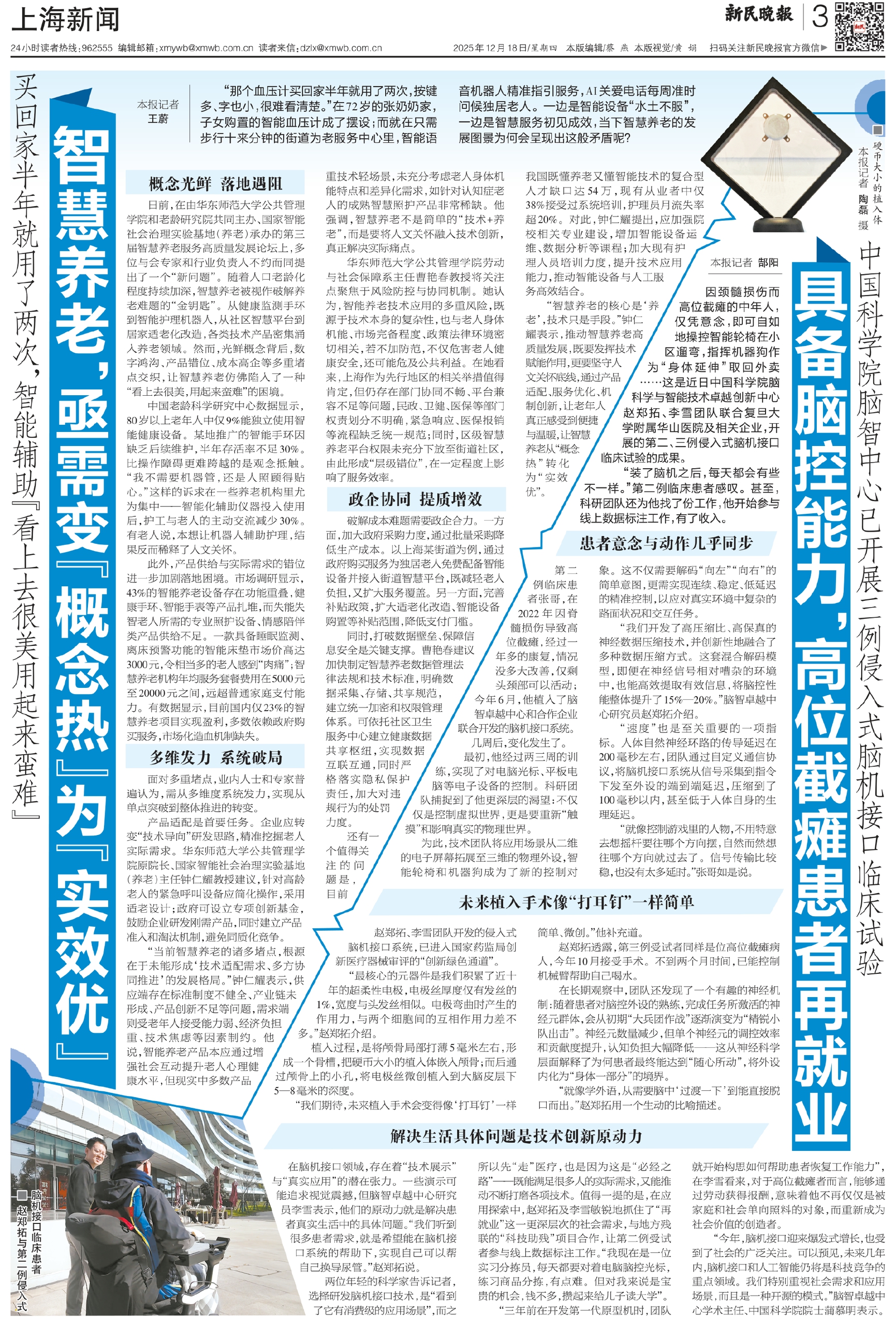 “当前智慧养老的诸多堵点,根源在于未能形成‘技术适配需求、多方协同推进’的发展格局。”钟仁耀表示,供应端存在标准制度不健全、产业链未形成、产品创新不足等问题,需求端则受老年人接受能力弱、经济负担重、技术焦虑等因素制约。他说,智能养老产品本应通过增强社会互动提升老人心理健康水平,但现实中多数产品重技术轻场景,未充分考虑老人身体机能特点和差异化需求,如针对认知症老人的成熟智慧照护产品非常稀缺。他强调,智慧养老不是简单的“技术+养老”,而是要将人文关怀融入技术创新,真正解决实际痛点。