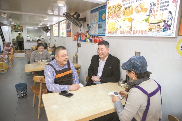 山北居民区商居联盟党支部书记花国民(左一)和周边沿街店铺人员交流 本版摄影 本报记者 周馨