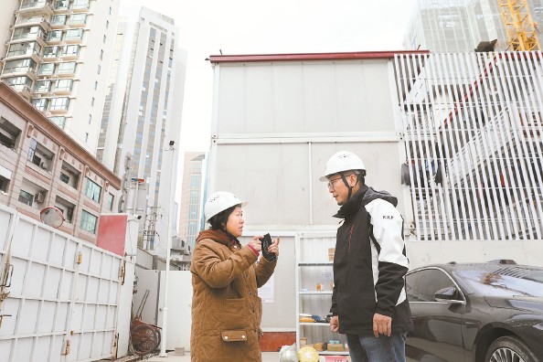 宝兴居民区党总支书记徐丽华(左)和东新大厦对面工地的项目负责人商量如何回应居民诉求
