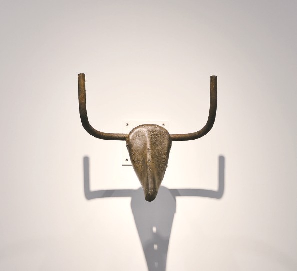 首次来华展出的毕加索标志性作品《牛头》(见下图 记者 王凯 摄)创作于1942年,由自行车鞍座与车把组合而成的这件作品,是毕加索艺术变形过程的典范之作,它成为整个展览开启视觉与意义的双重入口。从小喜欢骑自行车的保罗·史密斯就此打造出了呼应之作,并将跨媒材的幽默与直觉延伸至展览现场。接下来的长廊展示的是经过毕加索之手改过的画报。寥寥数笔,毕加索便将时尚摄影转化为荒诞图像,打破了杂志原有的平衡,扰乱了模特的从容姿态。