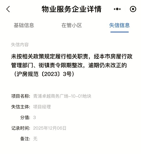 “上海物业”小程序显示,2025年12月6日,青浦卓越商务广场项目经理被处以失信记分3分,失信内容为“未按相关政策规定履行相关职责,经本市房屋行政管理部门、街镇责令限期整改,逾期仍未改正的(沪房规范〔2023〕3号)”。