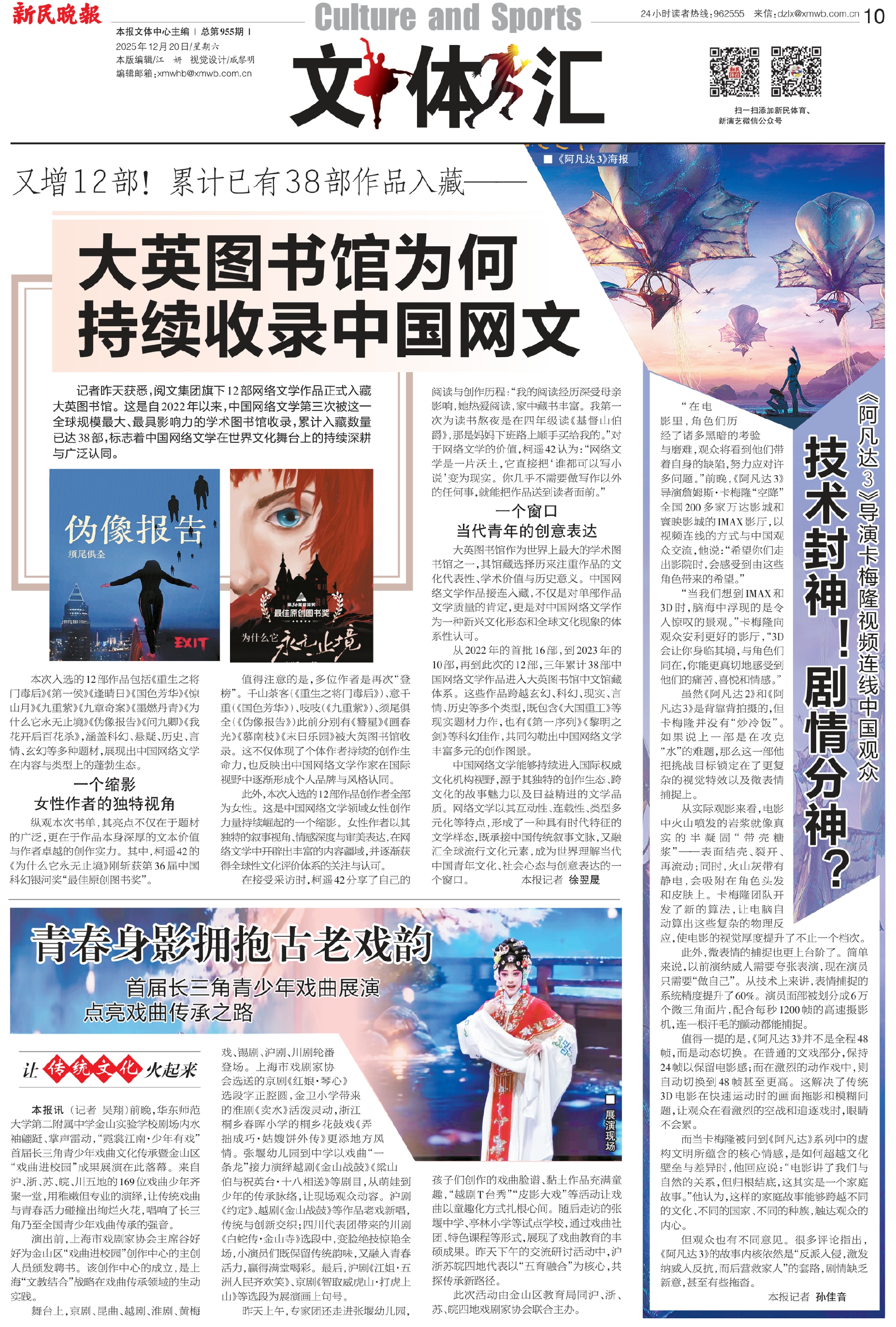 记者昨天获悉,阅文集团旗下12部网络文学作品正式入藏大英图书馆。这是自2022年以来,中国网络文学第三次被这一全球规模最大、最具影响力的学术图书馆收录,累计入藏数量已达38部,标志着中国网络文学在世界文化舞台上的持续深耕与广泛认同。