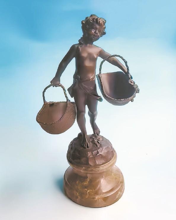 这款铜雕连底座高27厘米,底座直径11厘米,是一件复制品,原作出自法国雕塑大师奥古斯特·莫罗之手。莫罗出身顶尖雕塑世家,父亲与兄弟皆是法国知名雕塑家。他尤擅塑造女性人物与小天使造型,诸多作品现珍藏于欧洲知名艺术机构。