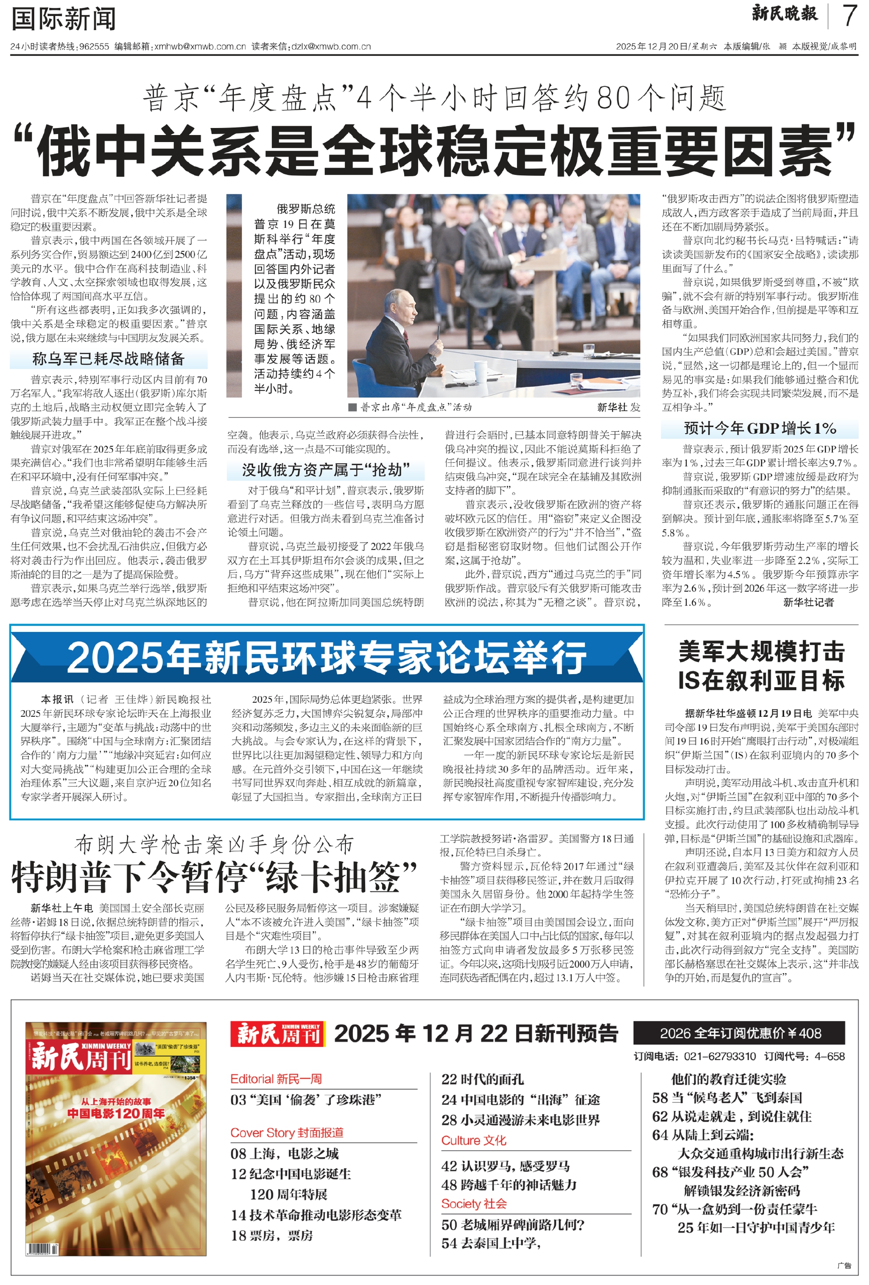 俄罗斯总统普京19日在莫斯科举行“年度盘点”活动,现场回答国内外记者以及俄罗斯民众提出的约80个问题,内容涵盖国际关系、地缘局势、俄经济军事发展等话题。活动持续约4个半小时。