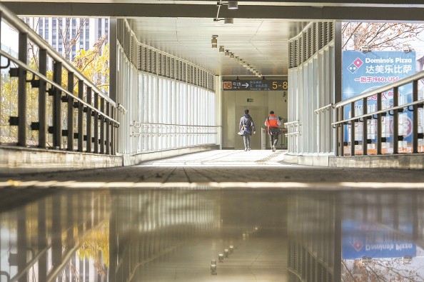 图为呼兰路站以“通道+天桥”的方式与既有1号线换乘 本报记者 陈梦泽 任天宝 摄影报道