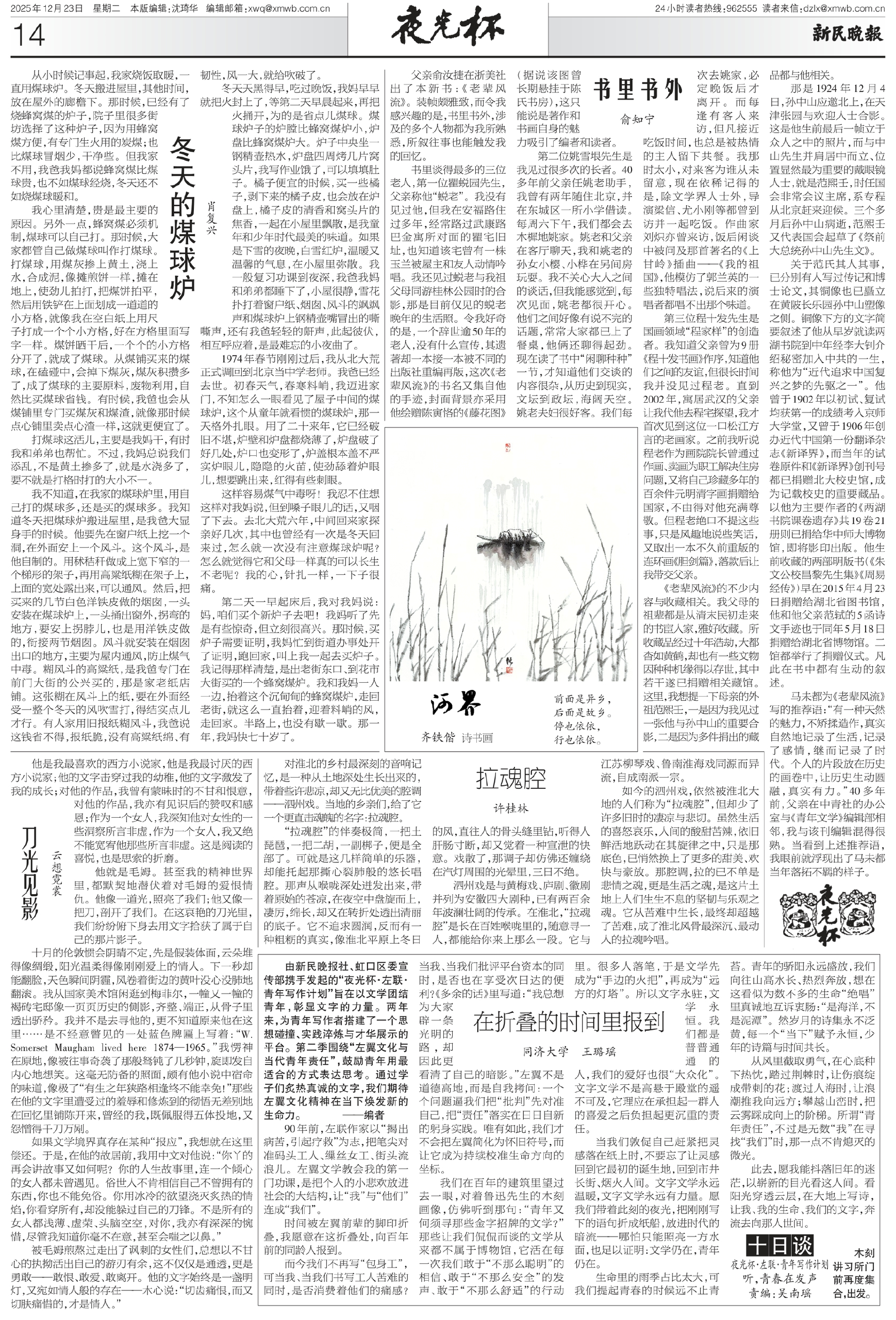 冬天天黑得早,吃过晚饭,我妈早早就把火封上了,等第二天早晨起来,再把火捅开,为的是省点儿煤球。煤球炉子的炉膛比蜂窝煤炉小,炉盘比蜂窝煤炉大。炉子中央坐一钢精壶热水,炉盘四周烤几片窝头片,我写作业饿了,可以填填肚子。橘子便宜的时候,买一些橘子,剥下来的橘子皮,也会放在炉盘上,橘子皮的清香和窝头片的焦香,一起在小屋里飘散,是我童年和少年时代最美的味道。如果是下雪的夜晚,白雪红炉,温暖又温馨的气息,在小屋里弥散。我一般复习功课到夜深,我爸我妈和弟弟都睡下了,小屋很静,雪花扑打着窗户纸、烟囱、风斗的飒飒声和煤球炉上钢精壶嘴冒出的嘶嘶声,还有我爸轻轻的鼾声,此起彼伏,相互呼应着,是最难忘的小夜曲了。