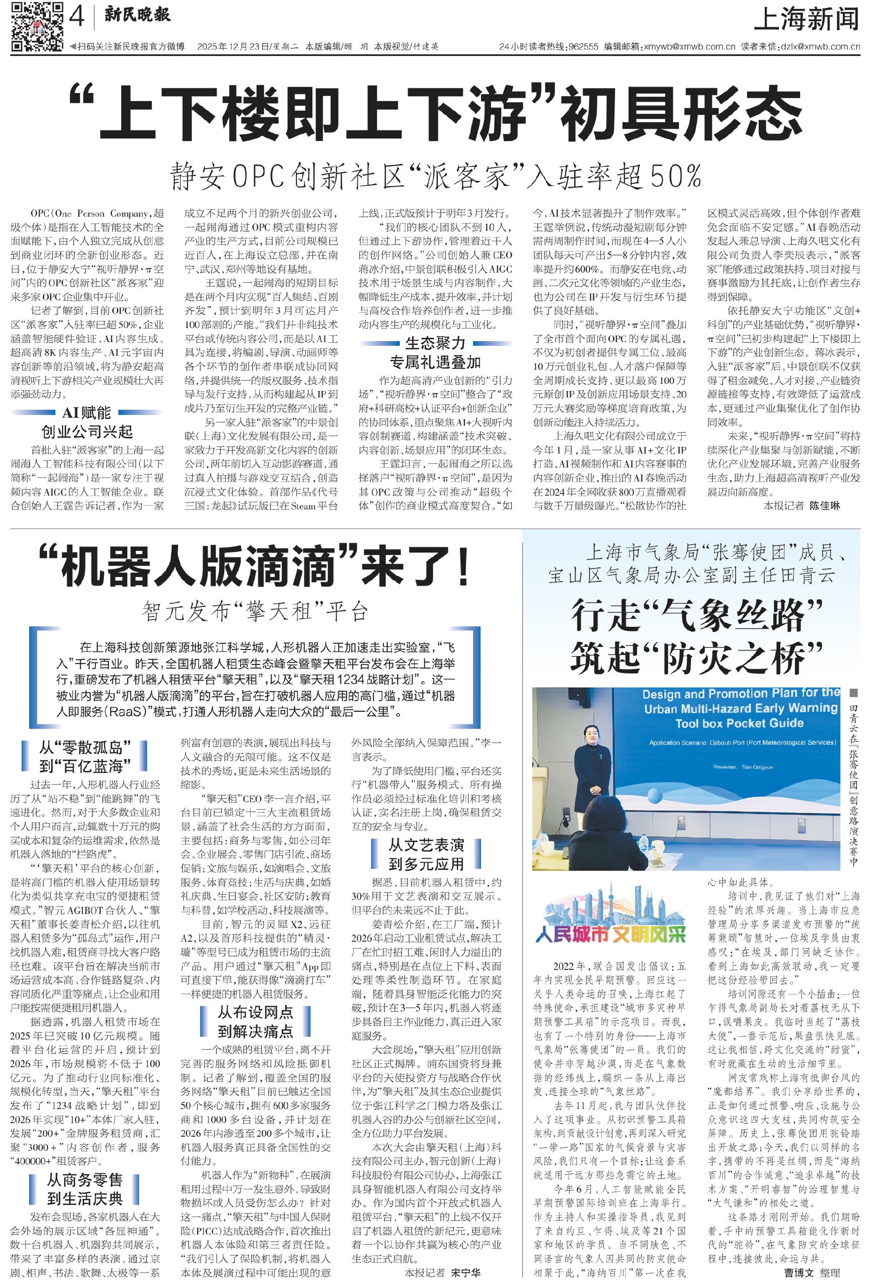 OPC(One Person Company,超级个体)是指在人工智能技术的全面赋能下,由个人独立完成从创意到商业闭环的全新创业形态。近日,位于静安大宁“视听静界·π空间”内的OPC创新社区“派客家”迎来多家OPC企业集中开业。