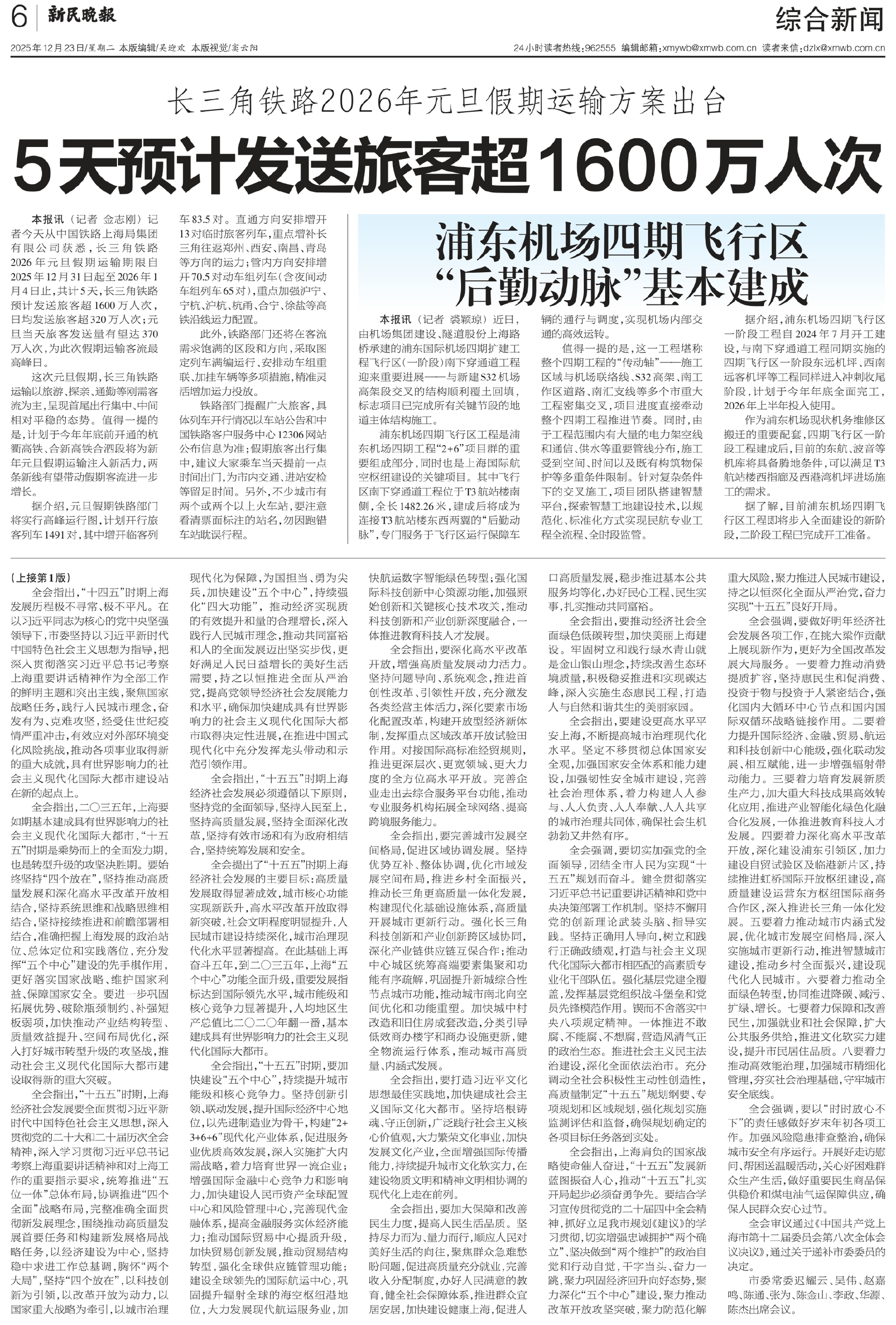 本报讯(记者 金志刚)记者今天从中国铁路上海局集团有限公司获悉,长三角铁路2026年元旦假期运输期限自2025年12月31日起至2026年1月4日止,共计5天,长三角铁路预计发送旅客超1600万人次,日均发送旅客超320万人次;元旦当天旅客发送量有望达370万人次,为此次假期运输客流最高峰日。