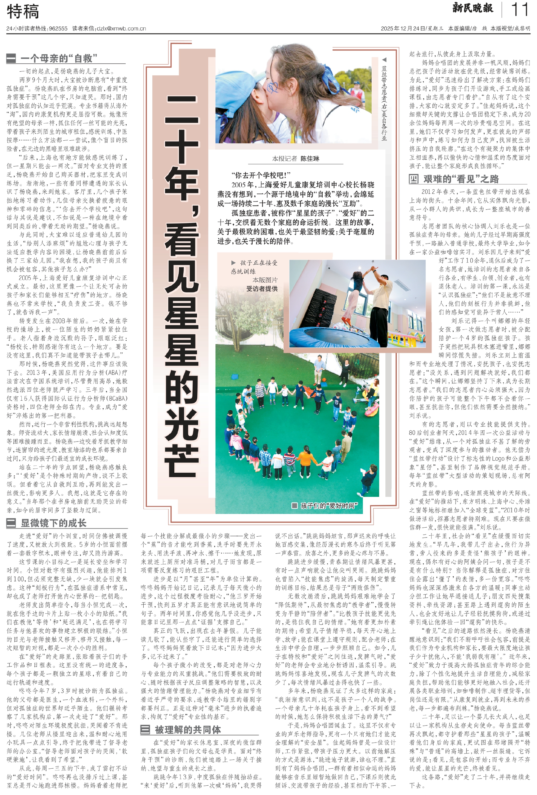 二十年,足以让一个婴儿长大成人,也足以让一家机构从生存走向使命。每当蓝丝带再次飘起,都守护着那些“星星的孩子”,温暖着他们身后的家庭,更试图在那堵隔开“特殊”与“普通”的高墙上,敲开一丝裂缝。它诉说的是:看见,是包容的开始;而专业与不弃的爱,能让星星的光芒,终被看见。