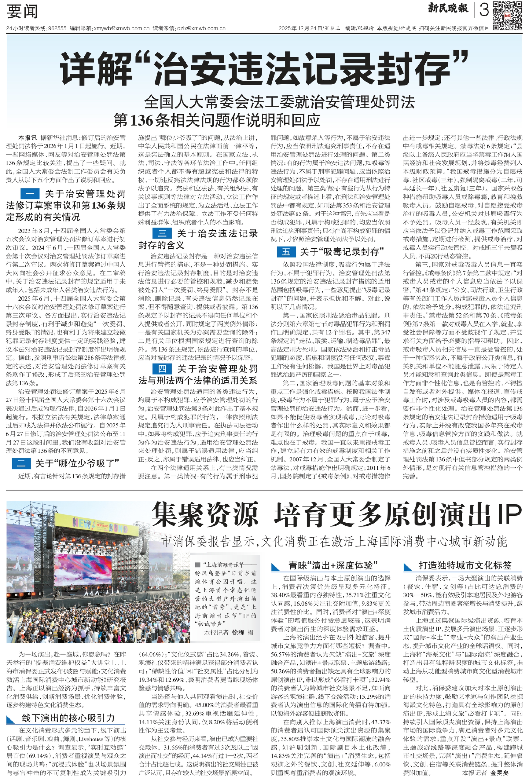本报讯 据新华社消息:修订后的治安管理处罚法将于2026年1月1日起施行。近期,一些网络媒体、网友等对治安管理处罚法第136条规定比较关注,提出了一些疑问。就此,全国人大常委会法制工作委员会有关负责人从以下五个方面作出了说明和回应。
