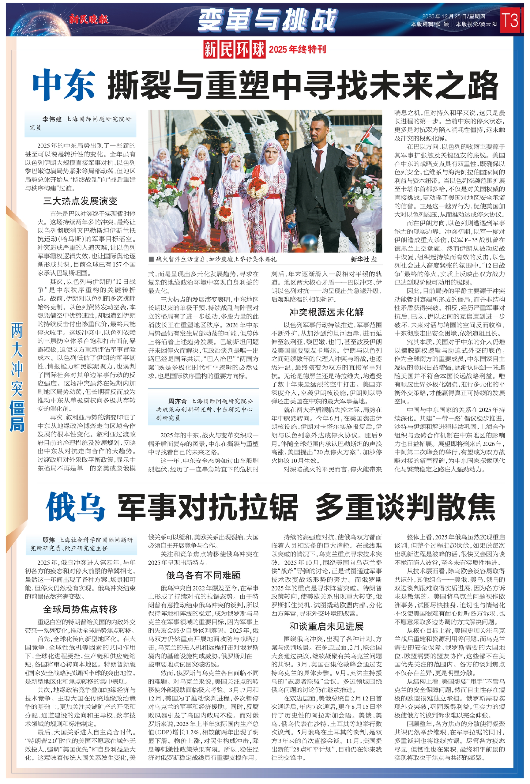 2025年的中东局势出现了一些新的甚至可以说是转折性的变化。全年虽有以色列伊朗大规模直接军事对抗、以色列黎巴嫩边境局势紧张等局部动荡,但地区局势总体开始从“持续战乱”向“战后重建与秩序构建”过渡。