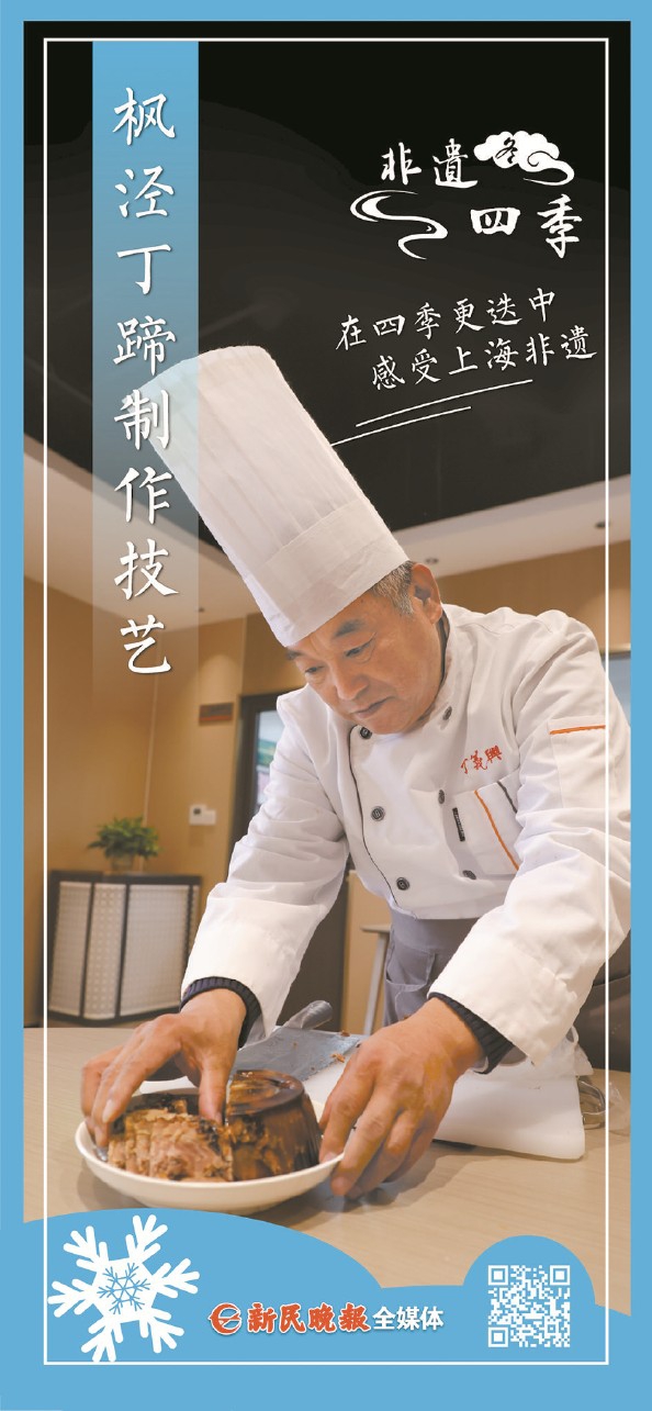 元旦春节团圆之际,蹄髈是节日餐桌上的常客。枫泾丁蹄是金山枫泾古镇的特产,也是上海的一张美食名片。枫泾丁蹄已有170多年历史,它以江南传统的“浓油赤酱”为主要味型,以独创的36道工序、“十料八工”为主要制作工艺,至今已传承至第七代。2007年,枫泾丁蹄制作技艺入选上海市非物质文化遗产代表性项目。