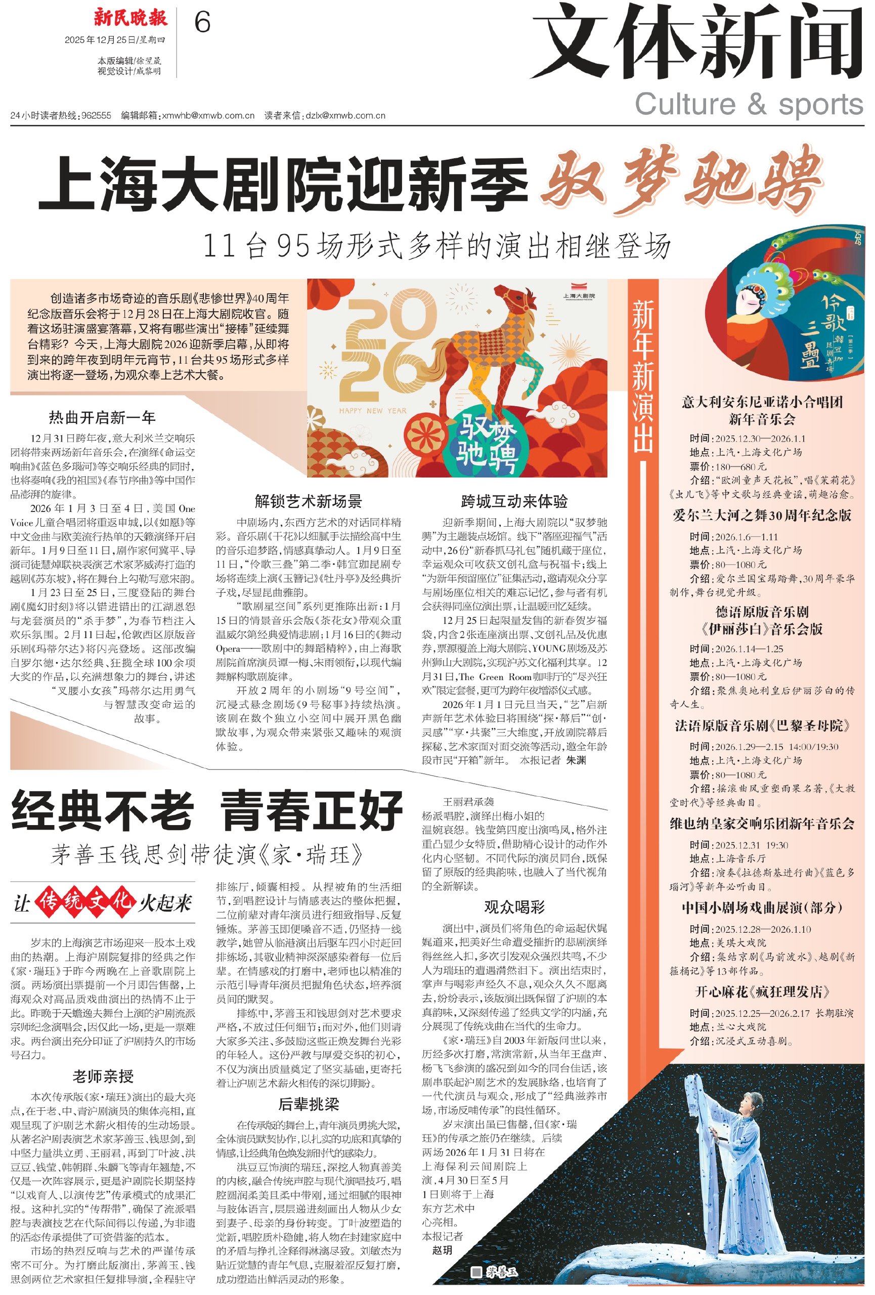 2026年1月1日元旦当天,“艺”启新声新年艺术体验日将围绕“探·幕后”“创·灵感”“享·共聚”三大维度,开放剧院幕后探秘、艺术家面对面交流等活动,邀全年龄段市民“开箱”新年。 本报记者 朱渊