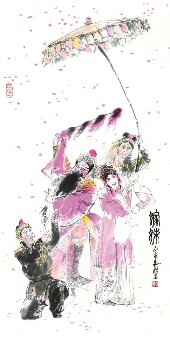 “翰墨戏韵——朱刚戏曲人物画展”通过约180组佳作,引领观众步入一个“戏中有画,画中有戏”的艺术世界。展览的起点,是艺术家戏画生涯的肇始之作——《通灵宝玉》。这幅创作于20世纪80年代的作品,打破了当时戏曲卡带封面多为演员肖像的惯例。当带有水墨贾宝玉封面的卡带推向市场之后,反响甚好,以至于许多戏曲名家都希望朱刚以“戏画”来包装他们主演的音像出版物。