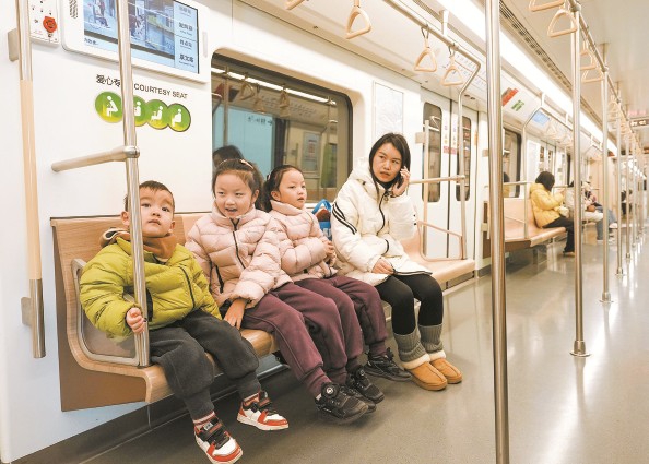 今天上午,张女士带着3个孩子乘坐地铁18号线出行 本报记者 陈梦泽 任天宝 摄影报道