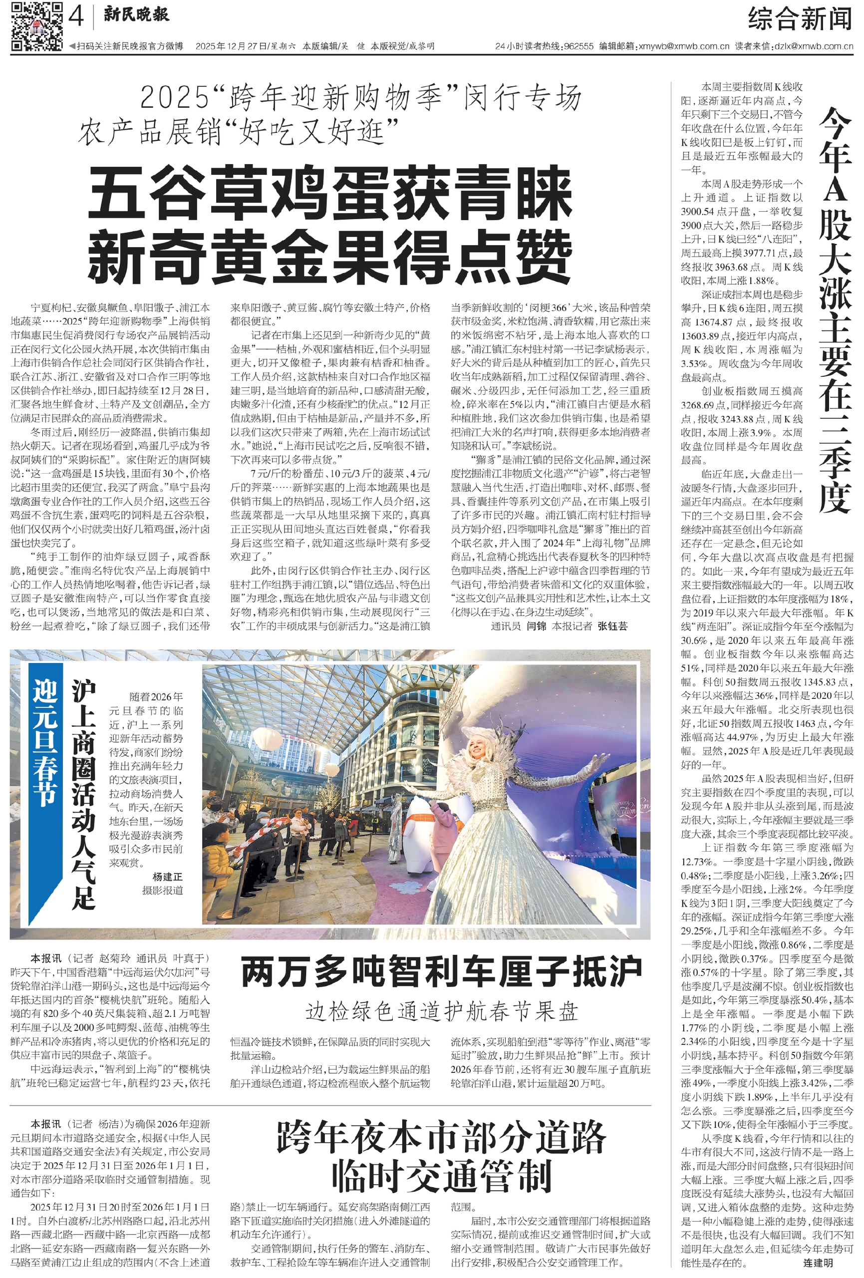 临近年底,大盘走出一波暖冬行情,大盘逐步回升,逼近年内高点。在本年度剩下的三个交易日里,会不会继续冲高甚至创出今年新高还存在一定悬念,但无论如何,今年大盘以次高点收盘是有把握的。如此一来,今年有望成为最近五年来主要指数涨幅最大的一年。以周五收盘位看,上证指数的本年度涨幅为18%,为2019年以来六年最大年涨幅。年K线“两连阳”。深证成指今年至今涨幅为30.6%,是2020年以来五年最高年涨幅。创业板指数今年以来涨幅高达51%,同样是2020年以来五年最大年涨幅。科创50指数周五报收1345.83点,今年以来涨幅达36%,同样是2020年以来五年最大年涨幅。北交所表现也很好,北证50指数周五报收1463点,今年涨幅高达44.97%,为历史上最大年涨幅。显然,2025年A股是近几年表现最好的一年。