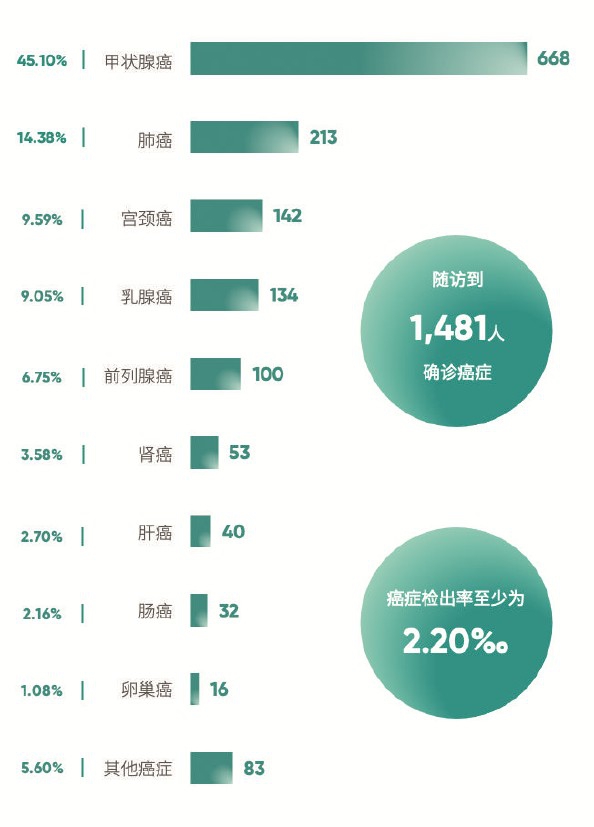 值得注意的是,在随访到的1481例癌症确诊个案中,甲状腺癌数量最多(668例),其后依次为肺癌、宫颈癌、乳腺癌和前列腺癌。这一分布与全国癌症发生率排名存在差异,主要原因是不同癌症在体检中的可检出性不同,同时也反映了体检项目选择的偏向性。