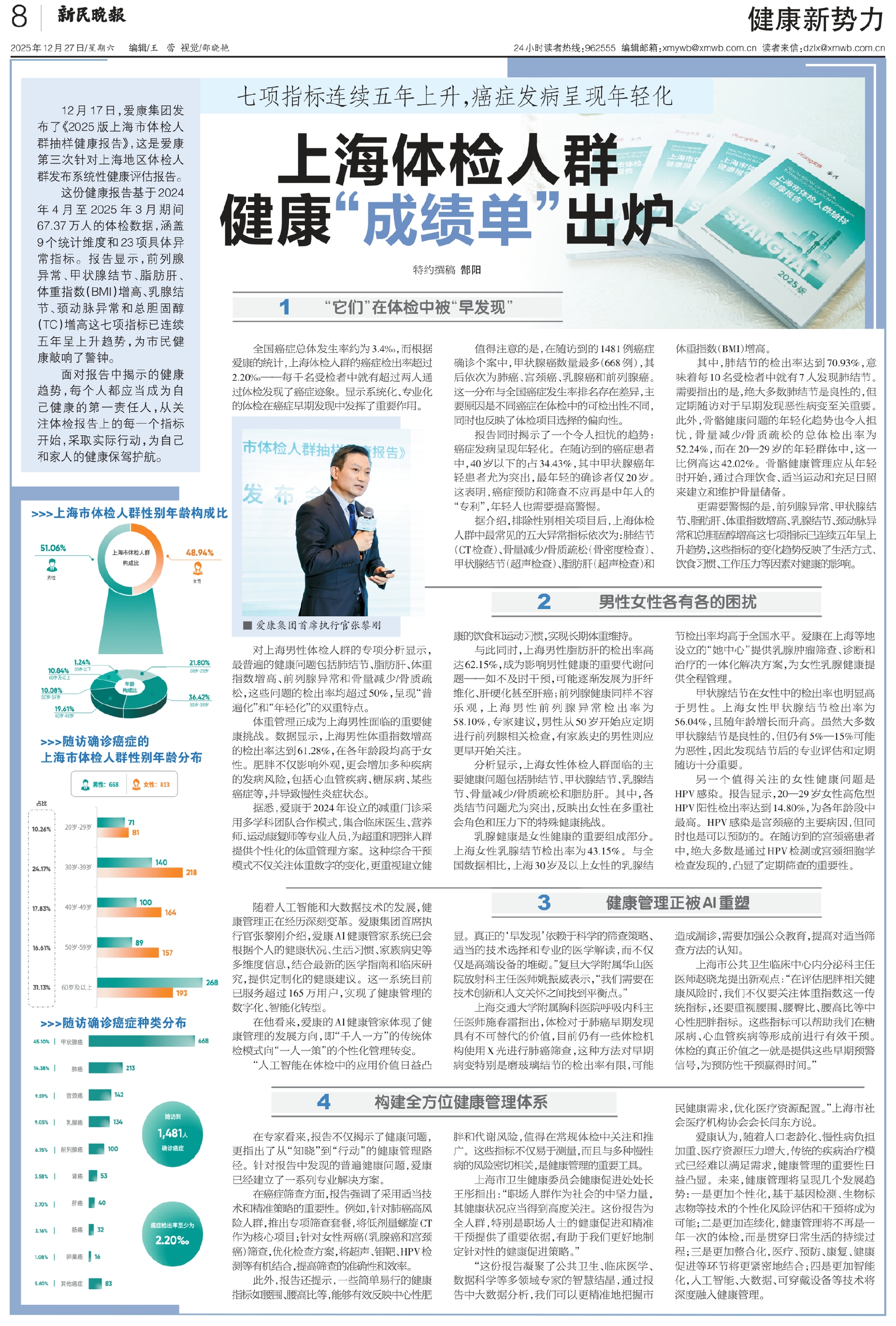 12月17日,爱康集团发布了《2025版上海市体检人群抽样健康报告》,这是爱康第三次针对上海地区体检人群发布系统性健康评估报告。