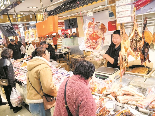 图为食品一店二楼腌腊柜台人气十足,手工香肠、咸肉、酱油肉、风干鸭腿等应有尽有,不少市民顾客专程前来选购年货
